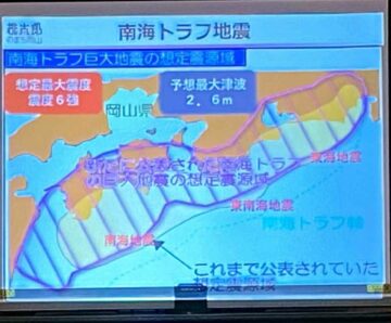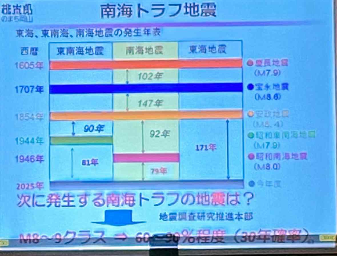 南海トラフ巨大地震は、100年から150年おきに来ています。 震度6弱から震度6強が想定されているので、必ず事前準備をして下さいと締めくくられました