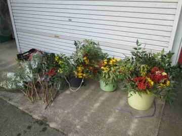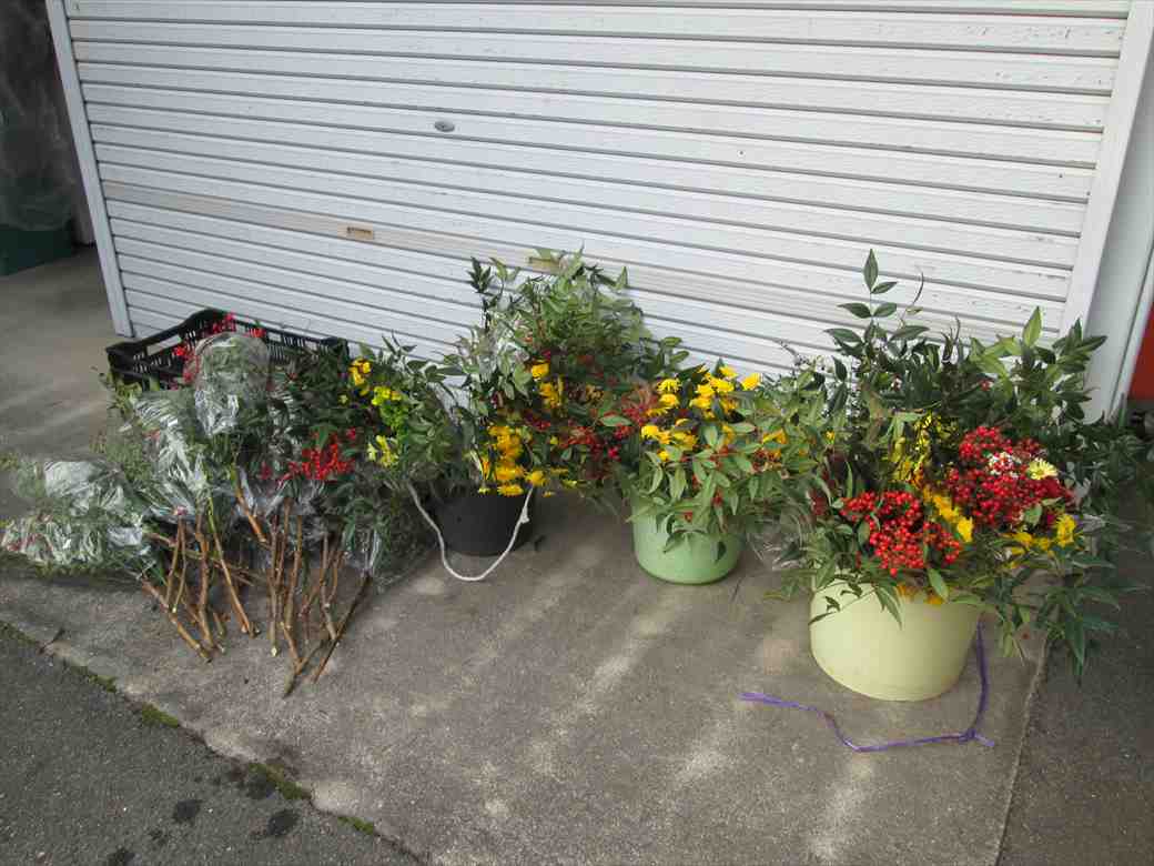 きれいなお花もたくさん出ています。小菊の黄色や南天の赤がとてもきれいです。お正月に向けての赤や黄のお花です。お正月用のお飾りもあります。