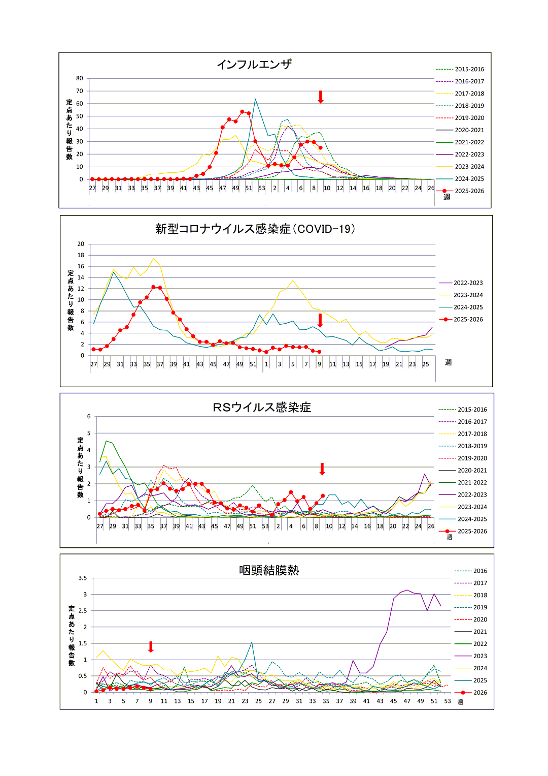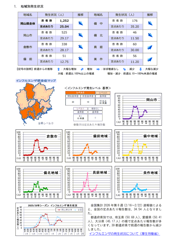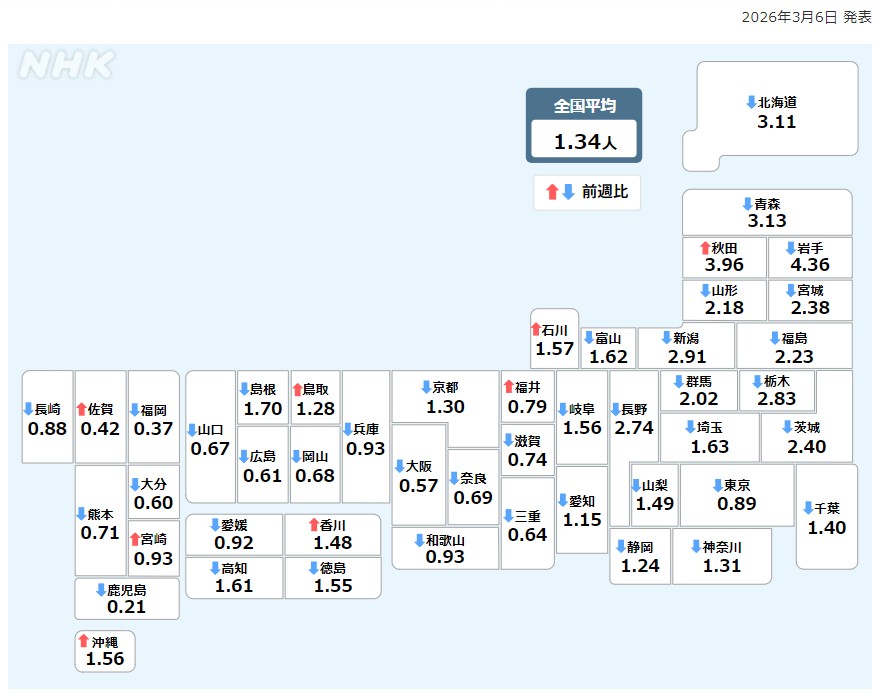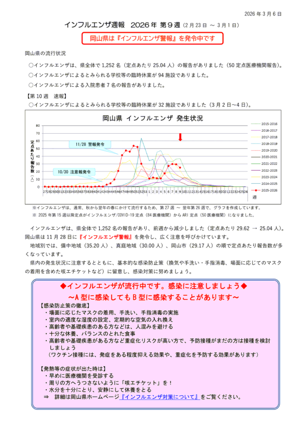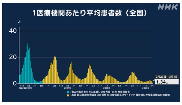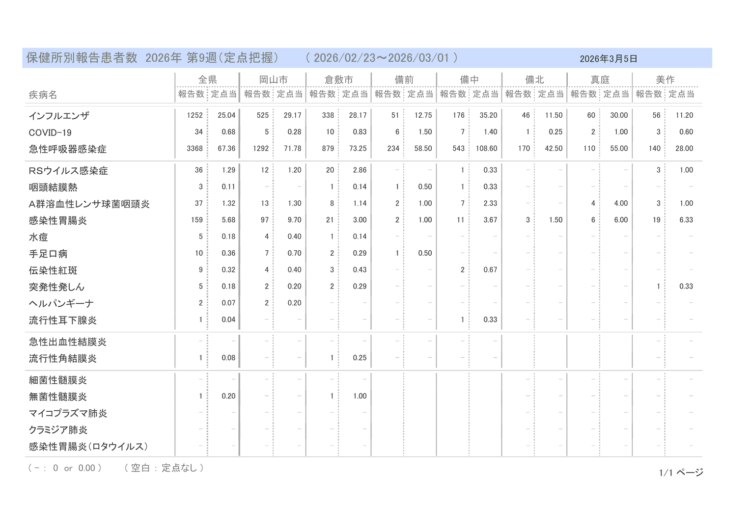 新型コロナウィルス感染症に関する情報リンク〜2026.03.06〜定点把握9週〜全国5,105人岡山34人:全国・岡山県ともに減少!