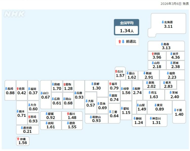 2月23日~3月5日 新型コロナの感染状況・(1医療機関あたり)NHK