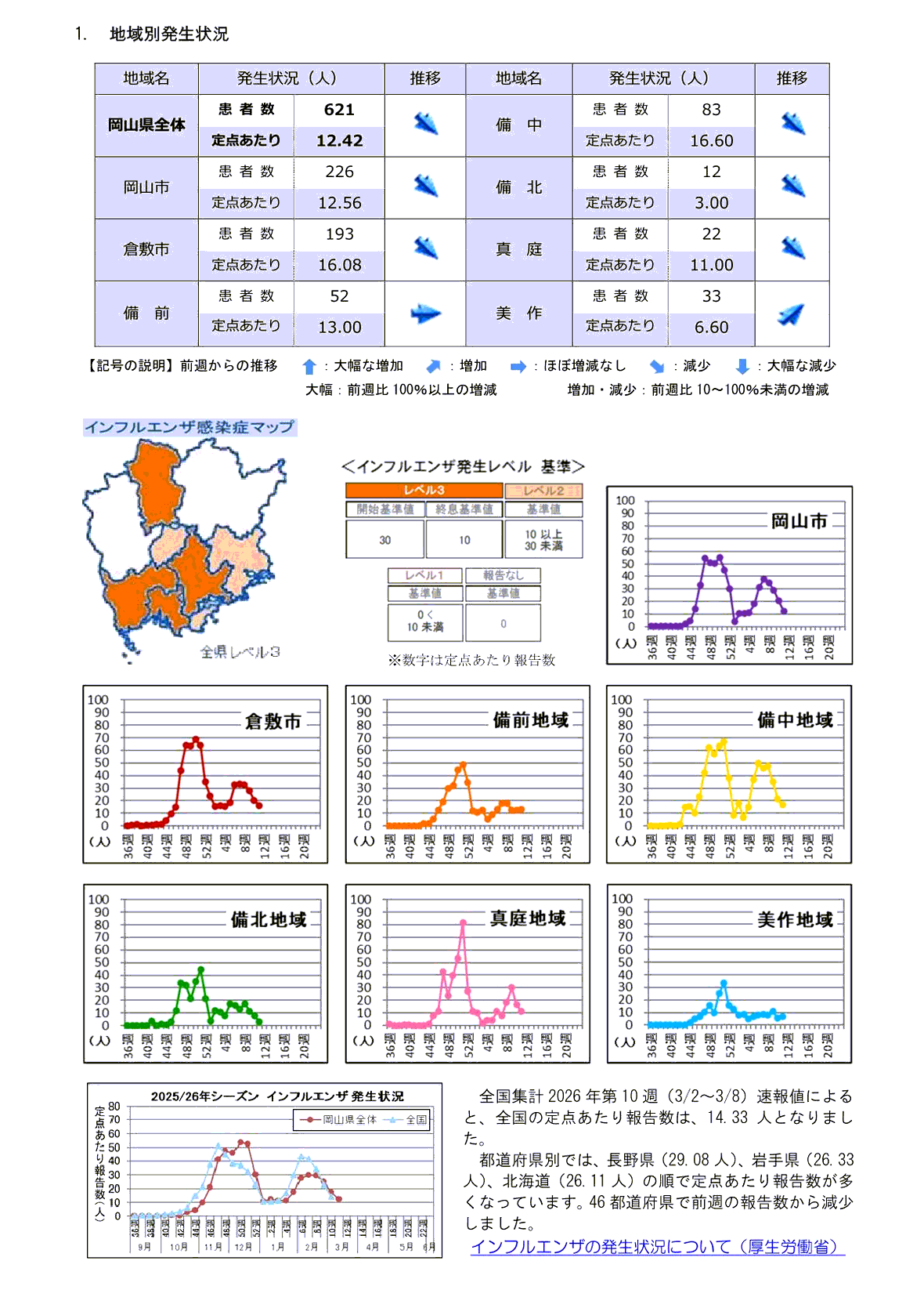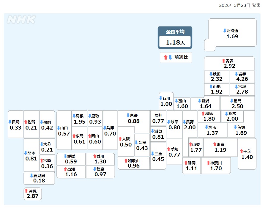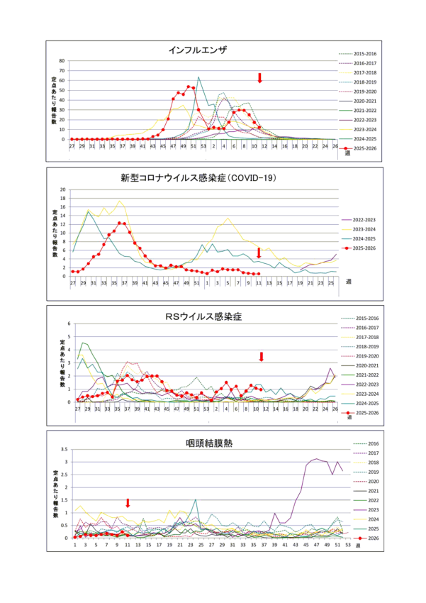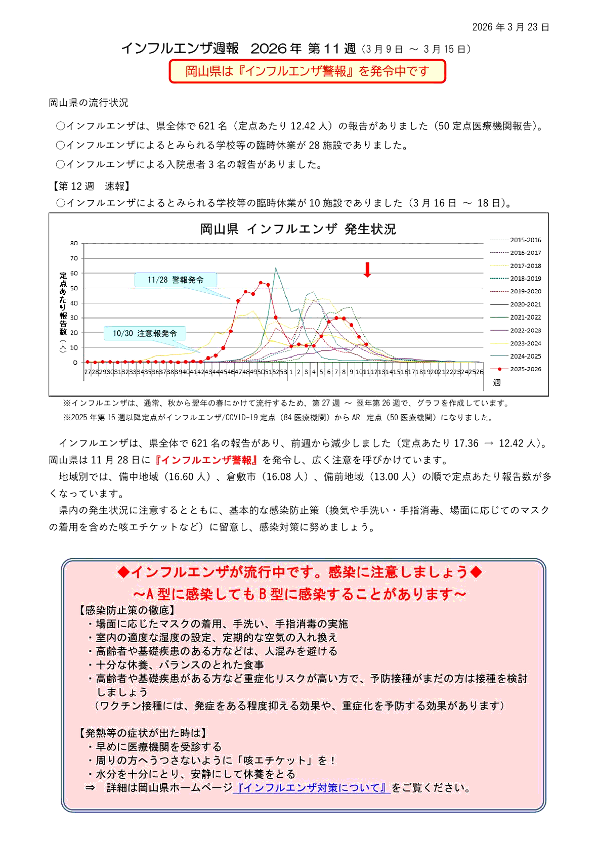 新型コロナウィルス感染症に関する情報リンク〜2026.03.23〜定点把握11週〜全国4,498人岡山30人:全国・岡山県ともに減少!