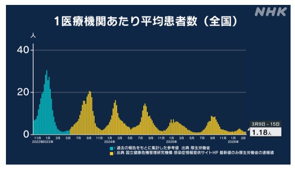 3月9日~3月15日 新型コロナの感染状況・(1医療機関あたり)NHK