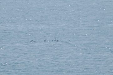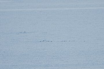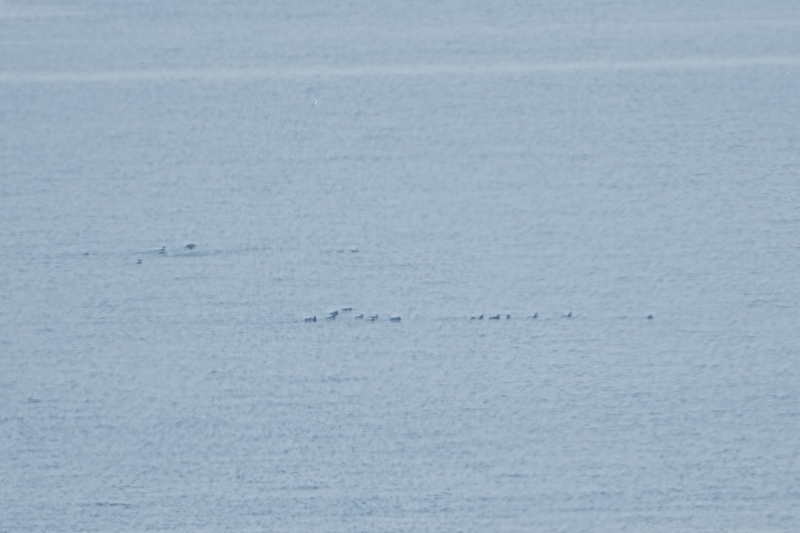 双眼鏡で沖合の点々のような鳥を数羽~10数羽の群れ何とか確認できました。