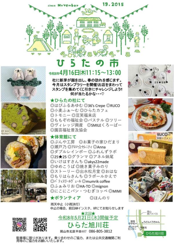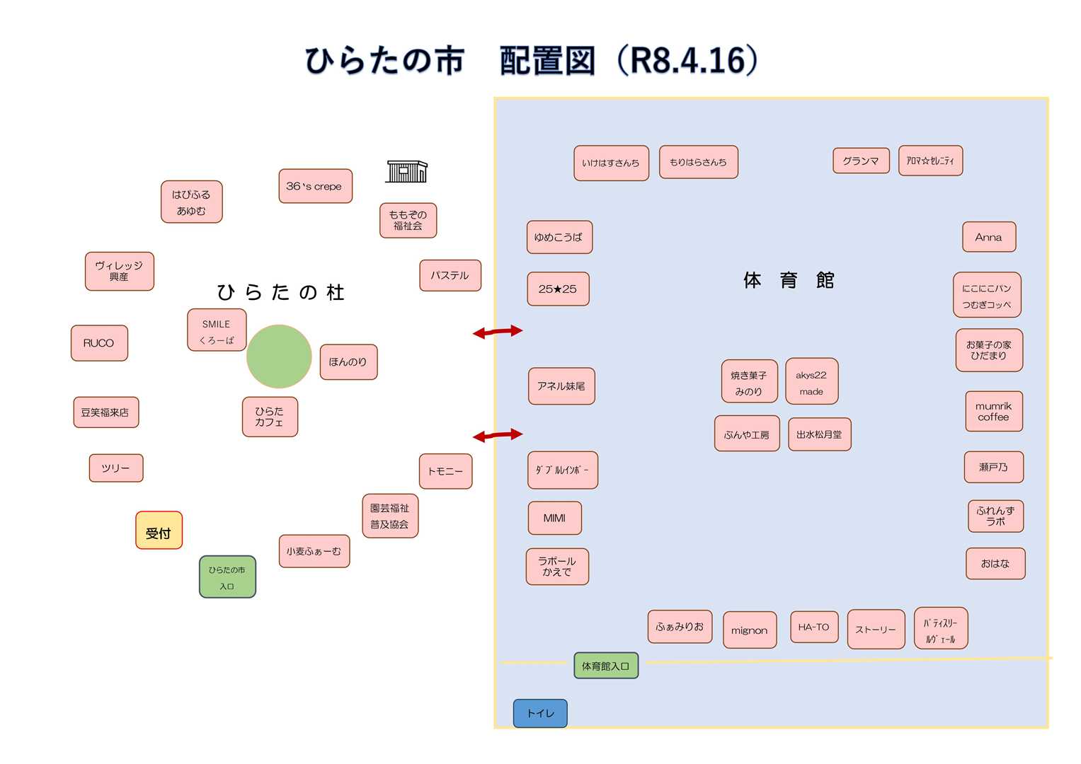 ひらた旭川荘の「ひらたの市」開催のご案内 ~4/16~ 投稿日:2026年4月3日 今月もご来場をお待ちしています。 配置図 ——————————– (No.3123) ※写真の上をクイックすると、拡大します。「前に戻る」で、元のページになります。 「前に戻る」は、「ブラウザの左矢印」または「マウス等の戻るボタン」を操作します。 カテゴリー:topics