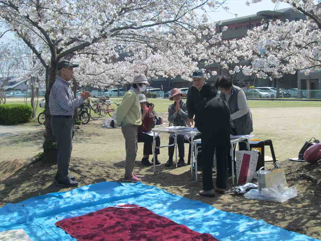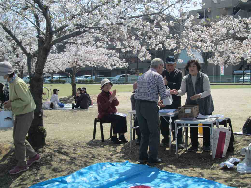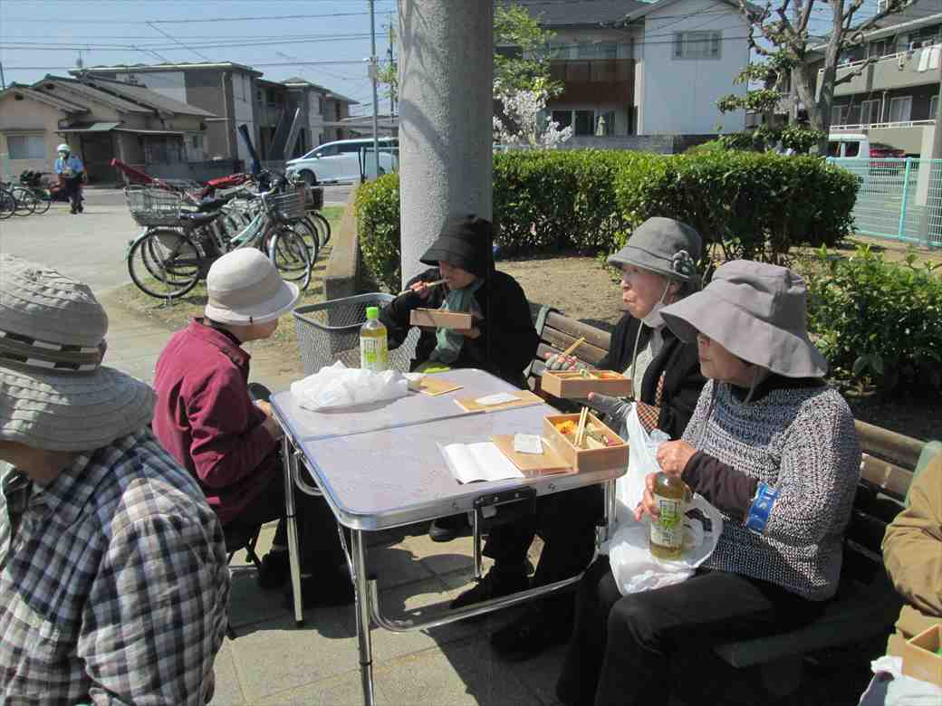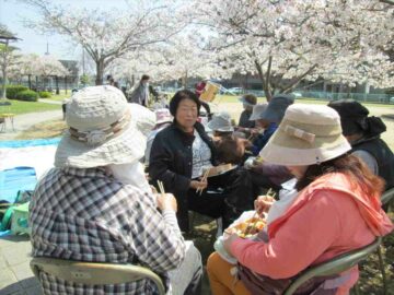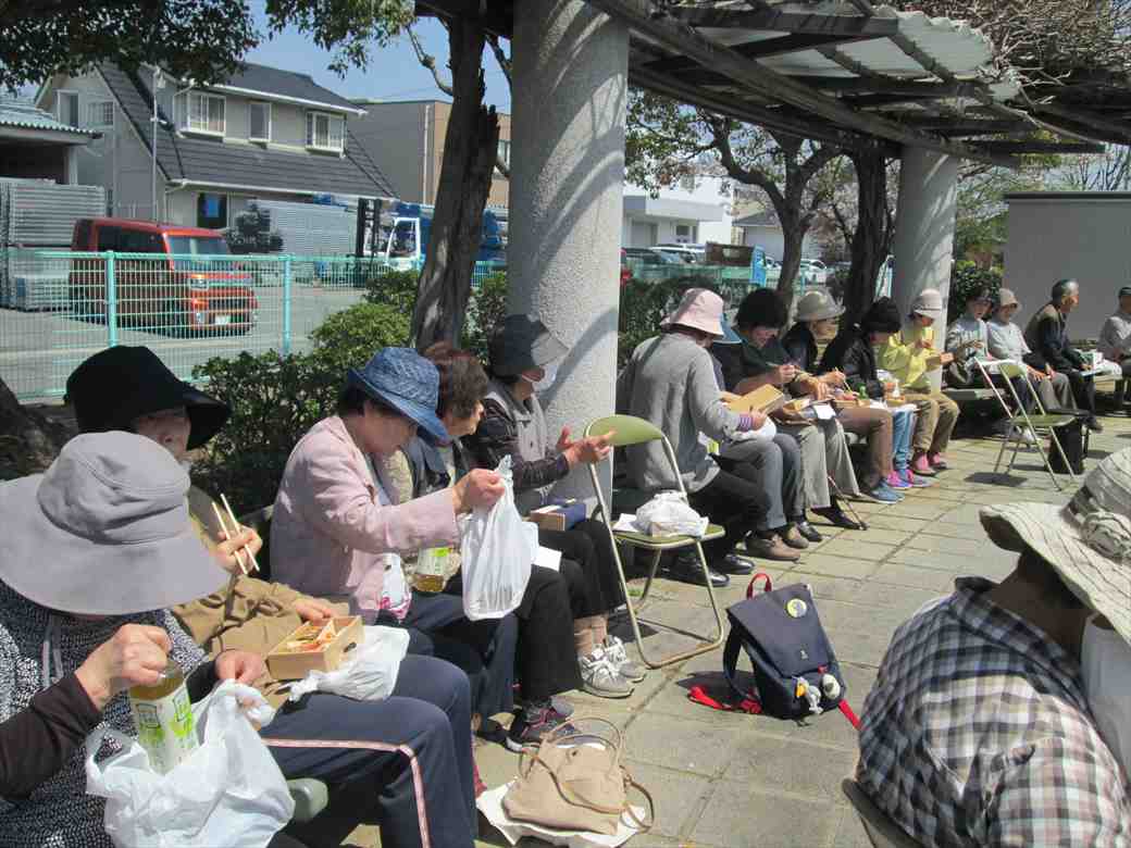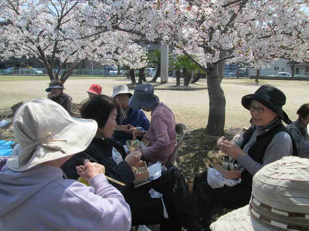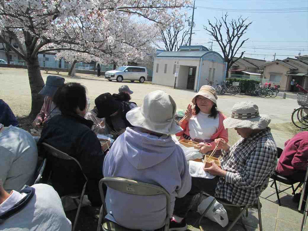 その後、時間のある方はお弁当を食べてワイワイとおしゃべりして楽しく過ごして帰りました。桜の花も満開でいいお花見となりました。少しの間でしたが話に花が咲きあっという間の時間でした。又、来年もしっかりお花見が楽しめることを期待して笑顔で総会を終了しました。(№3124)