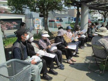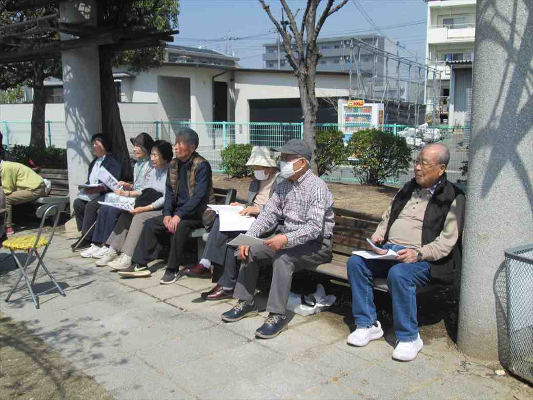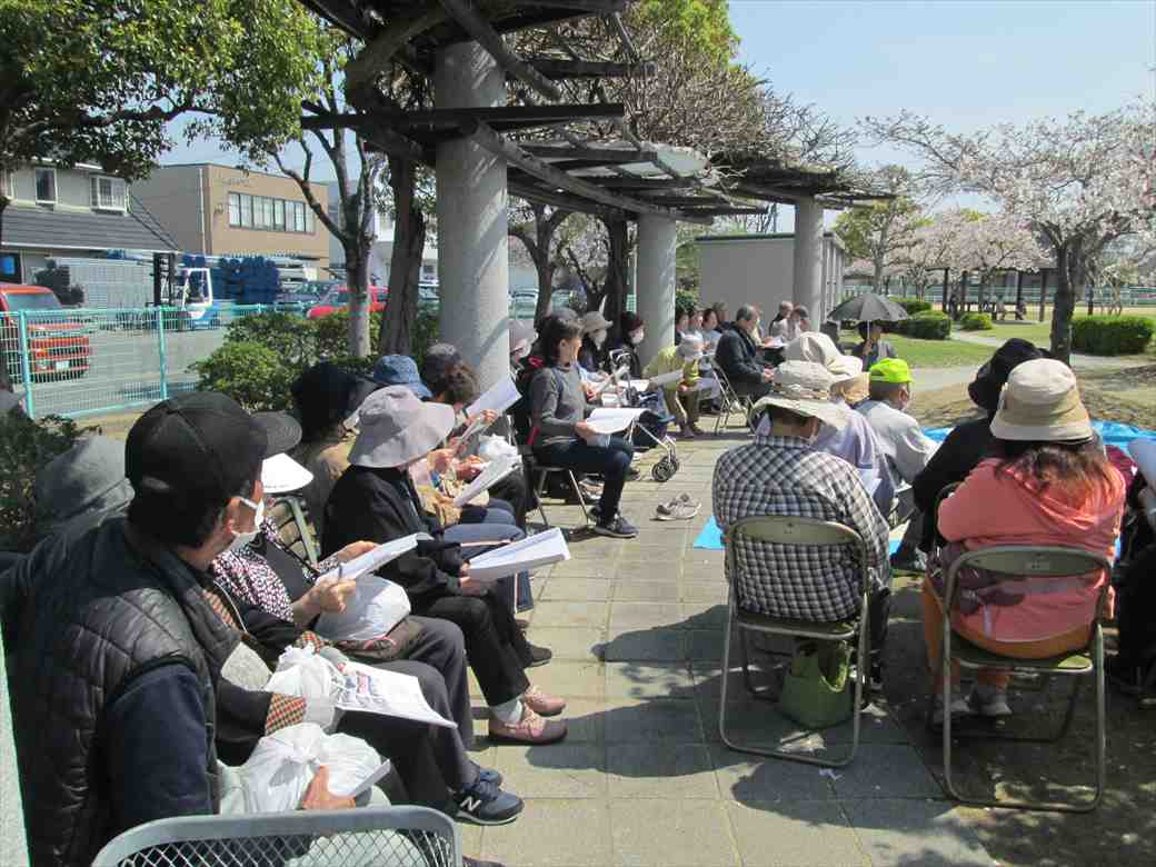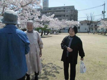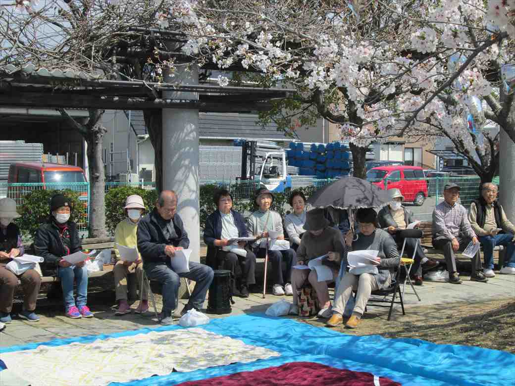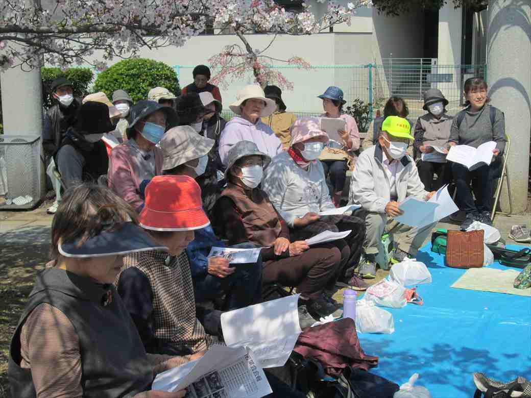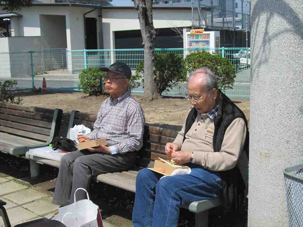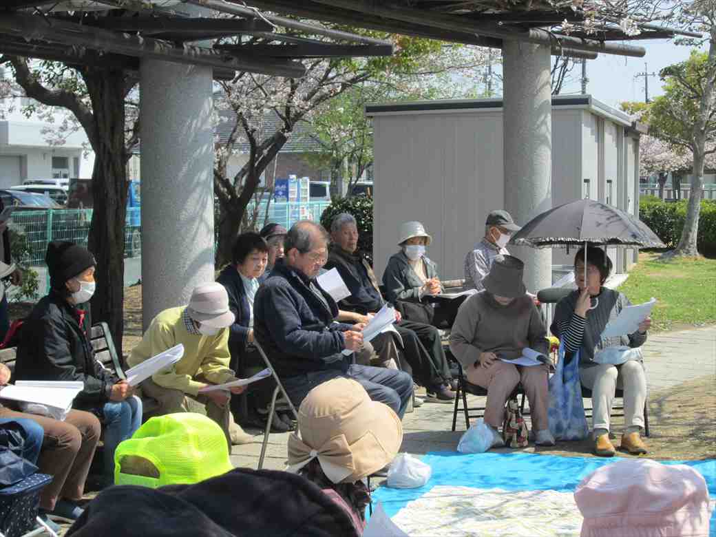 その後、時間のある方はお弁当を食べてワイワイとおしゃべりして楽しく過ごして帰りました。桜の花も満開でいいお花見となりました。少しの間でしたが話に花が咲きあっという間の時間でした。又、来年もしっかりお花見が楽しめることを期待して笑顔で総会を終了しました。(№3124)