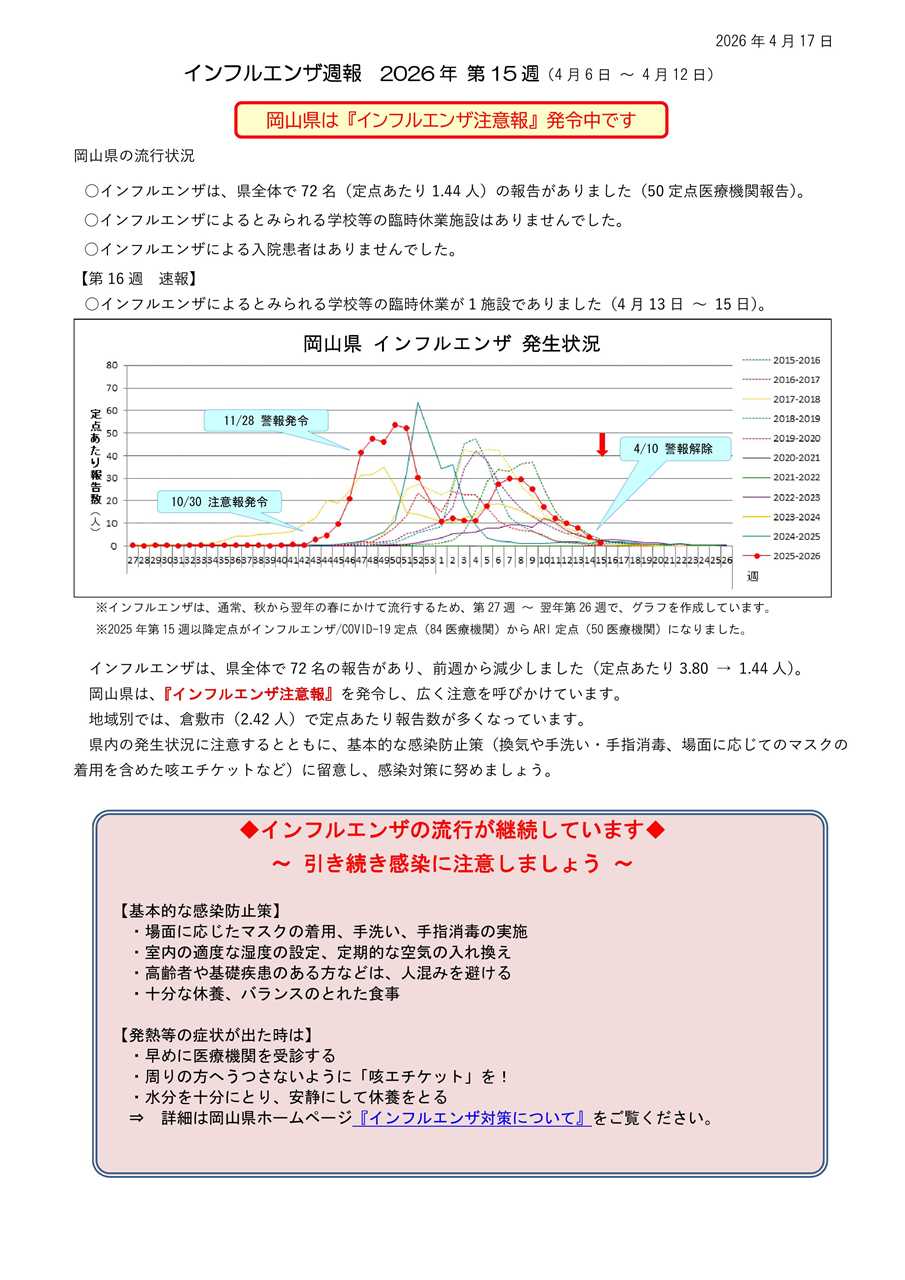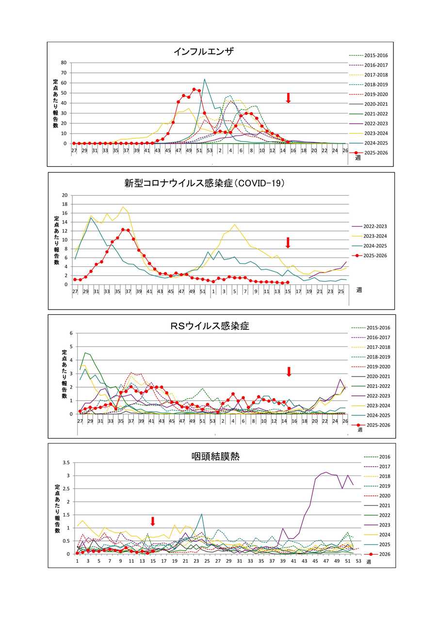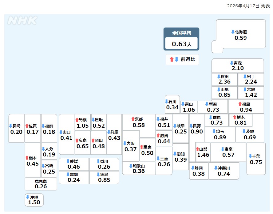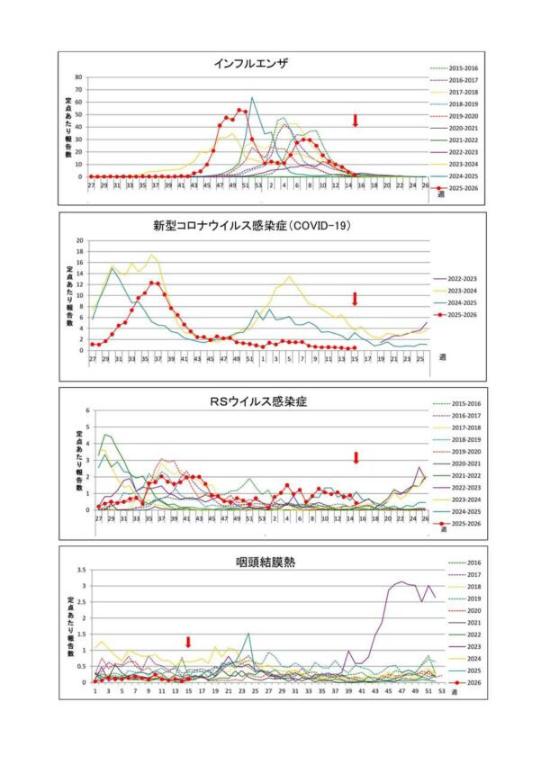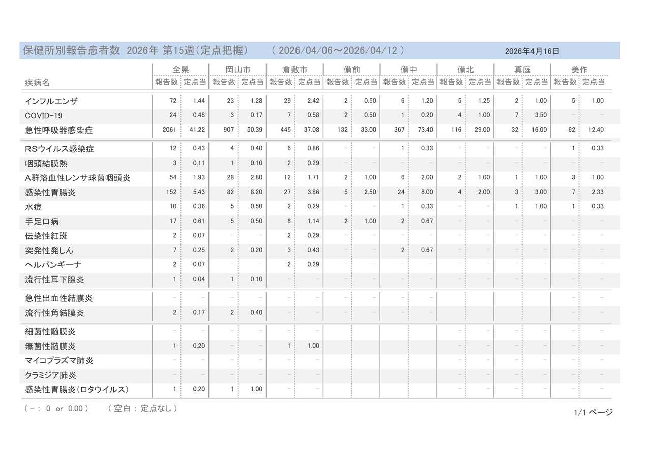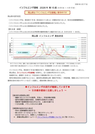 新型コロナウィルス感染症に関する情報リンク〜2026.04.17〜定点把握15週〜全国2,340人岡山24人:全国減少・岡山県は増加!