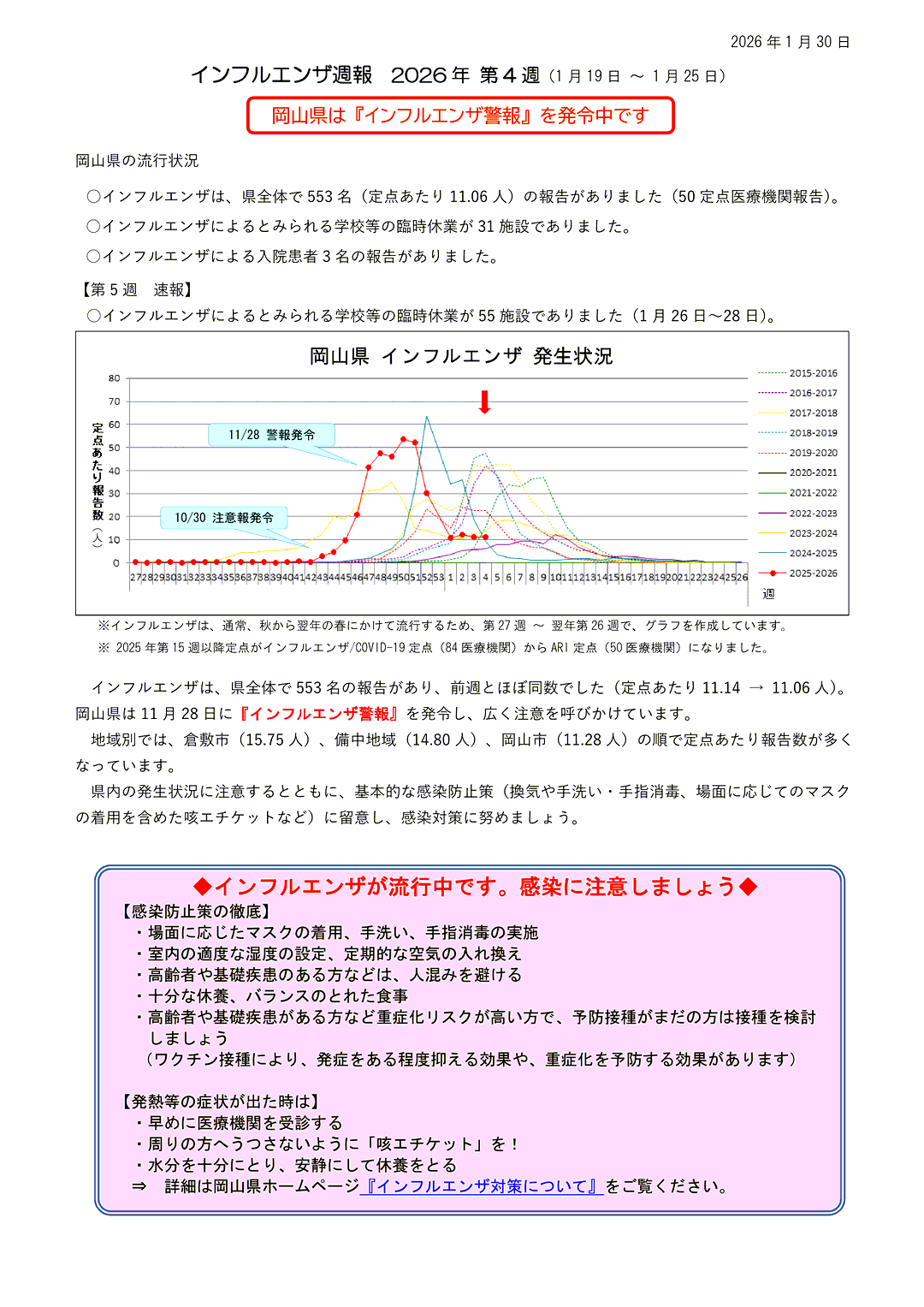 新型コロナウィルス感染症に関する情報リンク〜2026.01.30〜定点把握4週〜全国7,573人岡山86人:全国・岡山県共に増加!