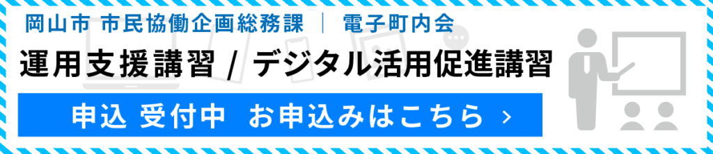 - 「電子町内会運用支援講習」は、岡山市市民協働企画総務課 及び電子町内会ヘルプデスクに設立の申請を済ませた町内会を対象としたものです。
