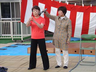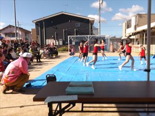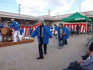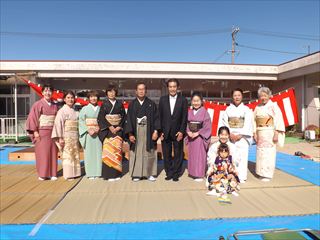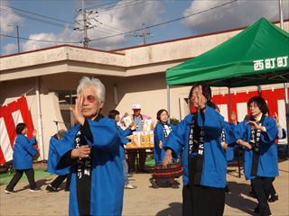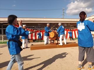 吉備津保育園園庭ではキッズエアロ、詩吟、扇舞、きものの着付け、オカリナ、練功(れんこう)、フォークダンス、宮内踊り、栄西踊りが行なわれました。