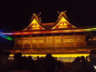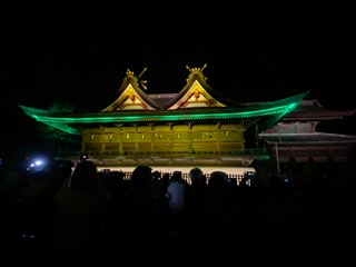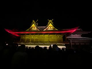吉備津神社で本殿拝殿再建600年を祝うライトアップの点灯式がありました。ライトアップされると本殿が明るく照らされて、光の色が青、黄、赤、緑など変化してとても美しかったです。