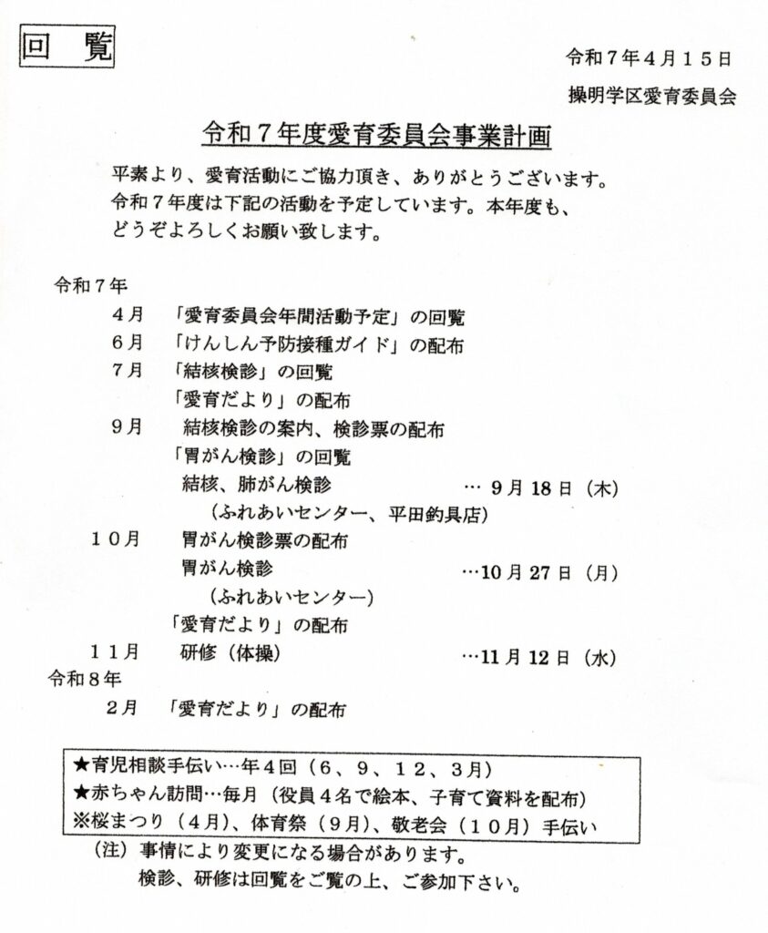 2019年度 操明学区愛育委員会活動予定
