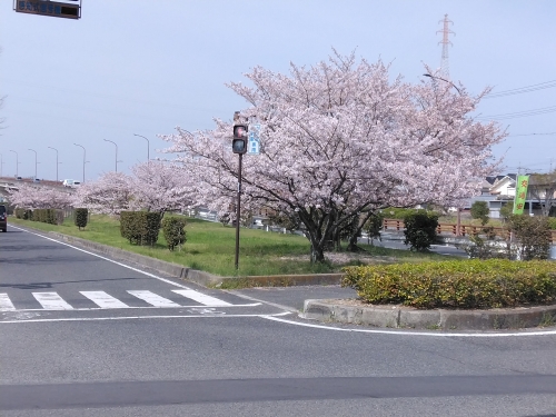 岡南大橋東詰め交差点西の桜 まだ満開 当日9時