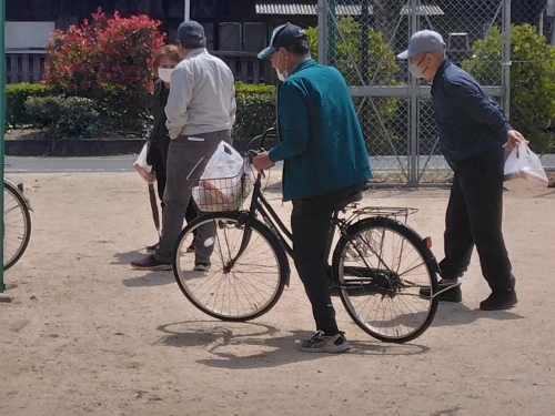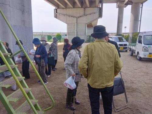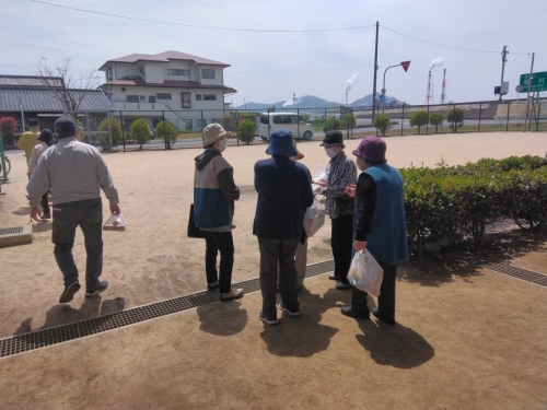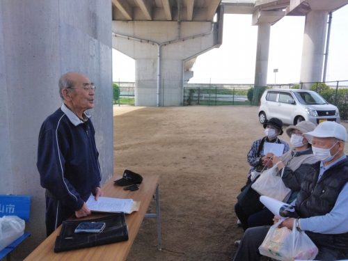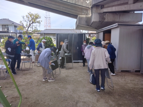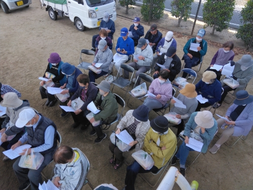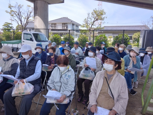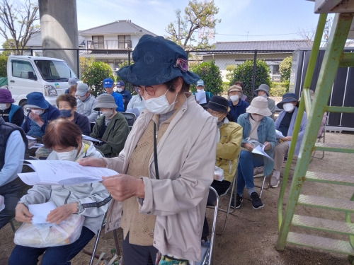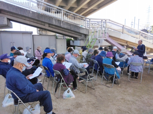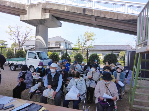 4月12日(日)午前11時から江並上ちびっこ広場(岡南大橋下公園)で江並上(中用水・浜中町内会)かがやきクラブの総会が開催されました。会員46名中34名が参加、片山会長から会員の高齢化が進み退会者が増加傾向にある、5名を目標に全会員で加入促進の声掛けを行いましょうと要請がありました。老人クラブの主目的は会員相互の親睦と社会奉仕活動ですが、高齢者が地域に貢献出来る事として昨今の治安の悪化で児童が犠牲になるニュースが多くこれからは小学生の下校時の見守り、声掛けを各自が出来る範囲で行いましょうと提案があり全員の賛同がありました。