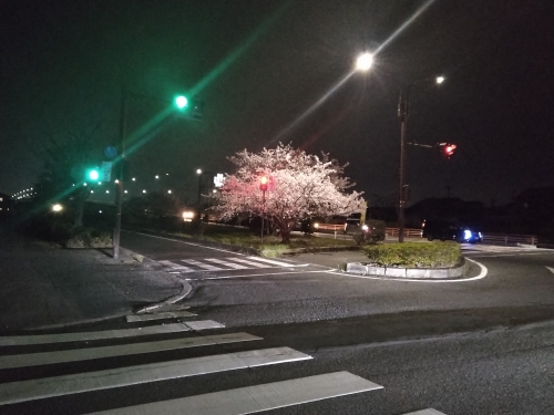 同日午後9時 朝と同場所 街路灯でライトアップされた夜桜 この時期限定の町内では幻想的な光景です