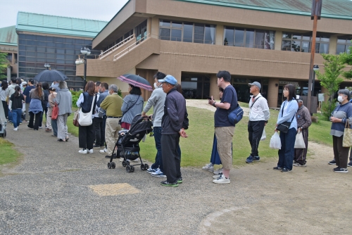 午前9時過ぎ、岡山ふれあいセンターの大きな駐車場が車でほぼ埋め尽くされている。