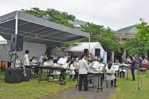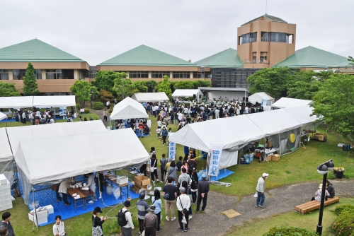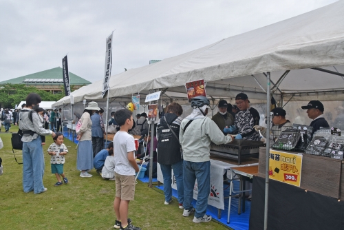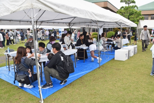 芝生広場にはテントが立ち並んでいて、大勢の人々。