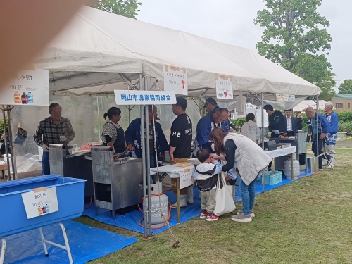 こちらは、岡山市漁業協同組合。 ただ、どのテントでも生魚はあまり見えない。もう売り切れてしまったとか。