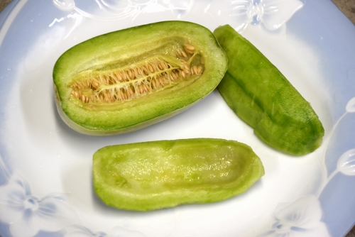 切ると中に種がいっぱい入っており、その種を除き、皮をむいで食べます。