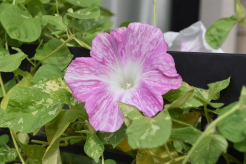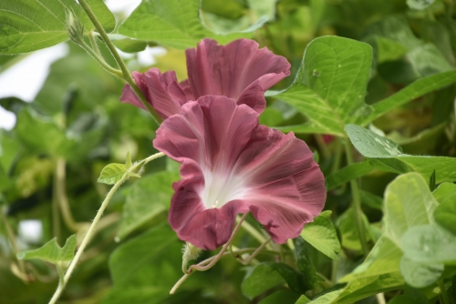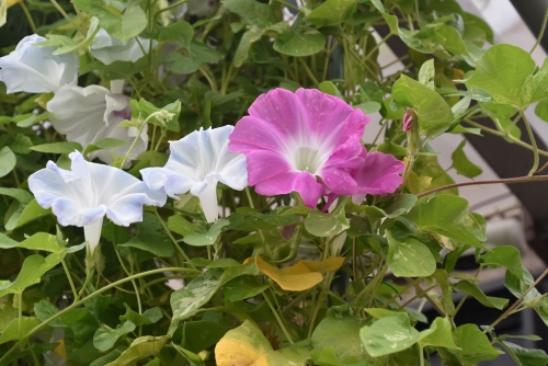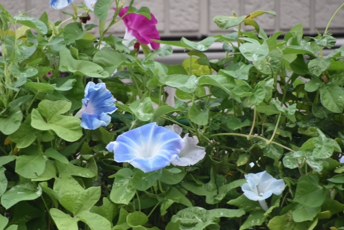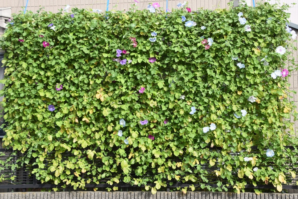 藤崎地内のお宅の玄関横にはアサガオの垣根が設けられていて、毎日手入れをされていることから、今も花が次々と咲いています。今年は夏が猛暑だったので、暑さが少し和らいだ今の方がきれいなぐらいです。しかし、よく見ると下の方は葉の色が変わってきています。やはり、時期なのかな。