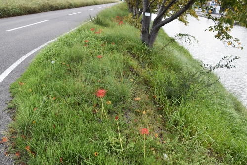 操明学区内ではヒガンバナの群生地がどうも見つからなく、やっと探し当てたのはふれあいセンターの東にある「のぼり橋」の東詰め、桜並木の桜の根元です。