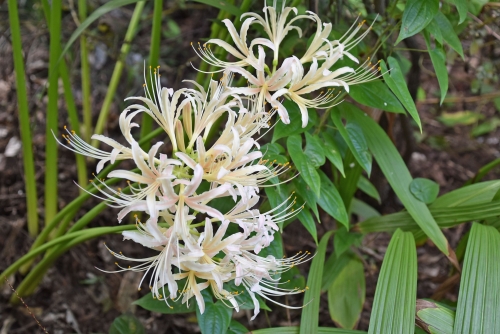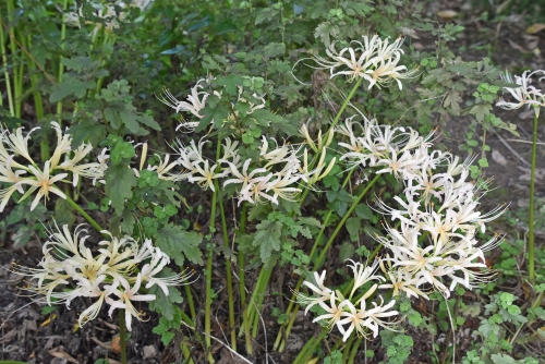 桜の木の下、草むらの中にヒガンバナ咲いていました