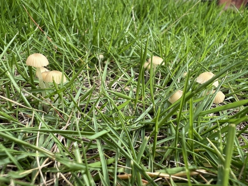 一方、こちらは別のお宅の庭。 やはりキノコが生えています。
