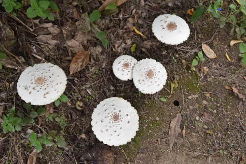 庭の木の下に白色のキノコが生えています