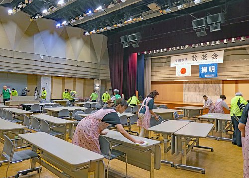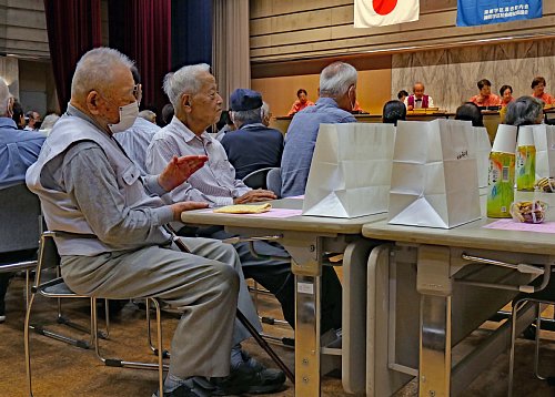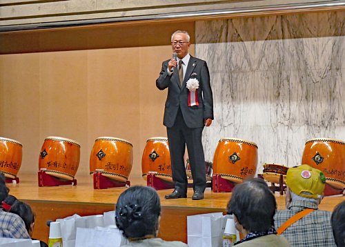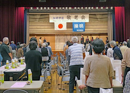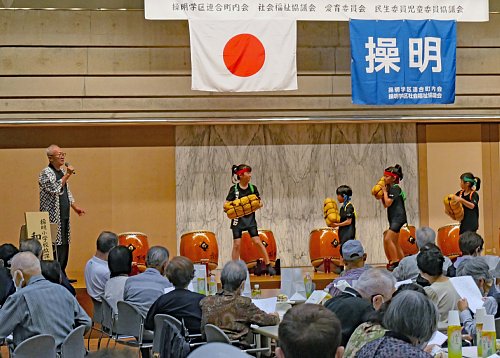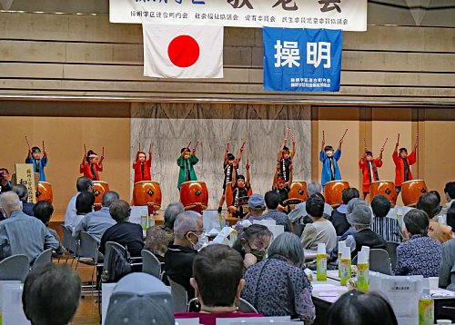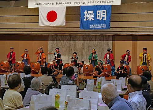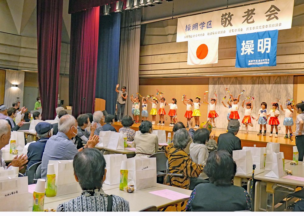 10月12日(日)令和7年度操明学区敬老会が行われました。数え年80才以上の方(今年は昭和21年生まれまで)が対象で今回は昨年より多い113名が参加しました。式典に続く演芸では今年も操明幼稚園児の可愛らしい歌や踊り、大正琴の調べ、よく練習された操明小和太鼓クラブ、OBのみずほクラブの迫力あるばちさばきは参加者に感動を与えてくれました。昨年から午前中のみの短時間での開催でしたが美味しそうなお弁当をお土産に知人やお友達と来年の再会を約し散会しました。準備から開催まで尽力された関係者の皆さん大変お世話になりました。