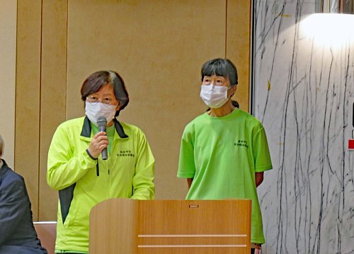 演芸の部 司会 社会福祉協議会 森光、森本さん(左より)