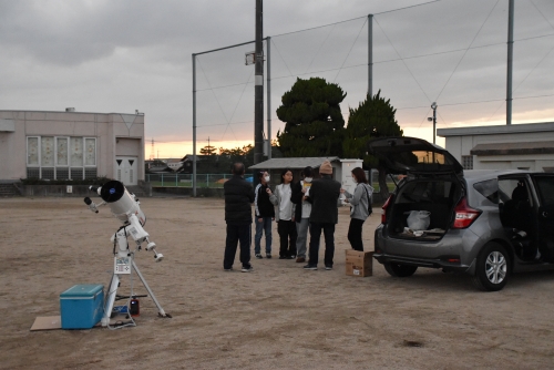 | 当初10/25(土)の開催予定でしたが、2度の開催日変更で11/2(日)の開催日を迎え、当日の準備中の5時半頃から雲行きが怪しくなり雨もポツポツ落ちてきました。開催困難と判断し急遽参加予定者へ電話で中止の連絡をしましたが、その後30分程してから雲が少なくなり月も出て、残っていた親子1組3名での開催となりました。今回はレモン彗星を見れる期間が短期間という制約の中で、参加申込みの方には、天候の為とは言え実施が二転三転し申し訳ありませんでした。次回(2/28予定)の開催には是非ご参加をお願いいたします。 |