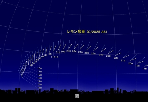 前回太陽に接近したのは今から1300年位前(聖徳太子の時代かな)と言われるレモン彗星が10月下旬から見頃を迎えています。11月8日に太陽に最も近づき、10日を過ぎると見えにくくなるようです。日没1時間位から西の空の低い位置に見え始め、小さいながらボンヤリと緑色に輝く彗星を探してみては。双眼鏡の使用が良いらしいです。次に太陽に接近するのは1100年後とされているので今が貴重な機会です。