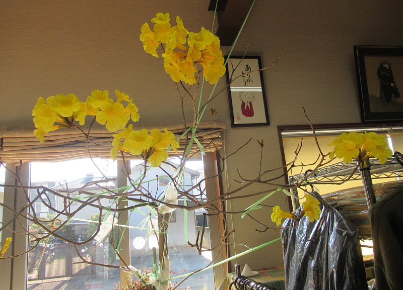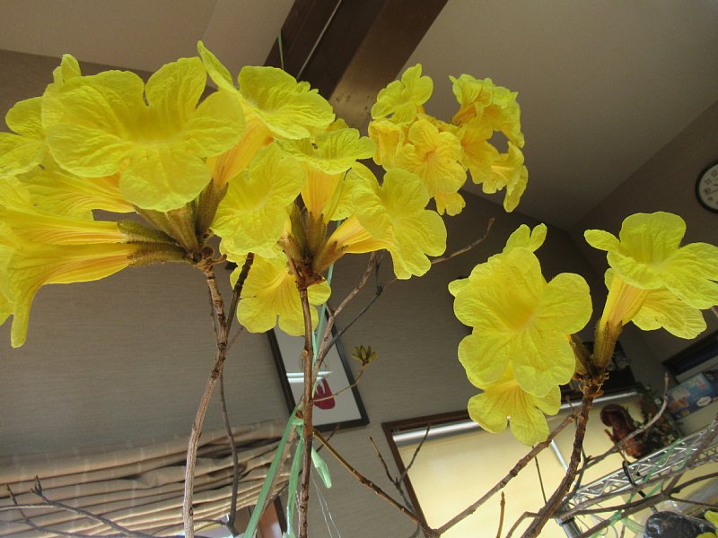 イペーは南米原産落葉樹で、日本では沖縄、鹿児島、宮崎、高知等の温暖地には見ることができます。岡山では夏は外、冬は室内で育てています。今年は昨年末から花芽ができ、正月には咲き始めました。例年は2月か3月頃の開花ですが、暖冬なのかもう開花しました。黄色のラッパ状の大きな花びらです。昨年は木に実がなり、その実から苗木をたくさん作りました。もう少し大きくなったら、お好きな方にお分けしたいと思います。