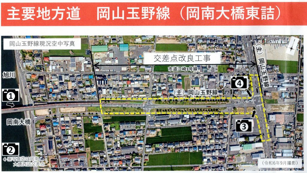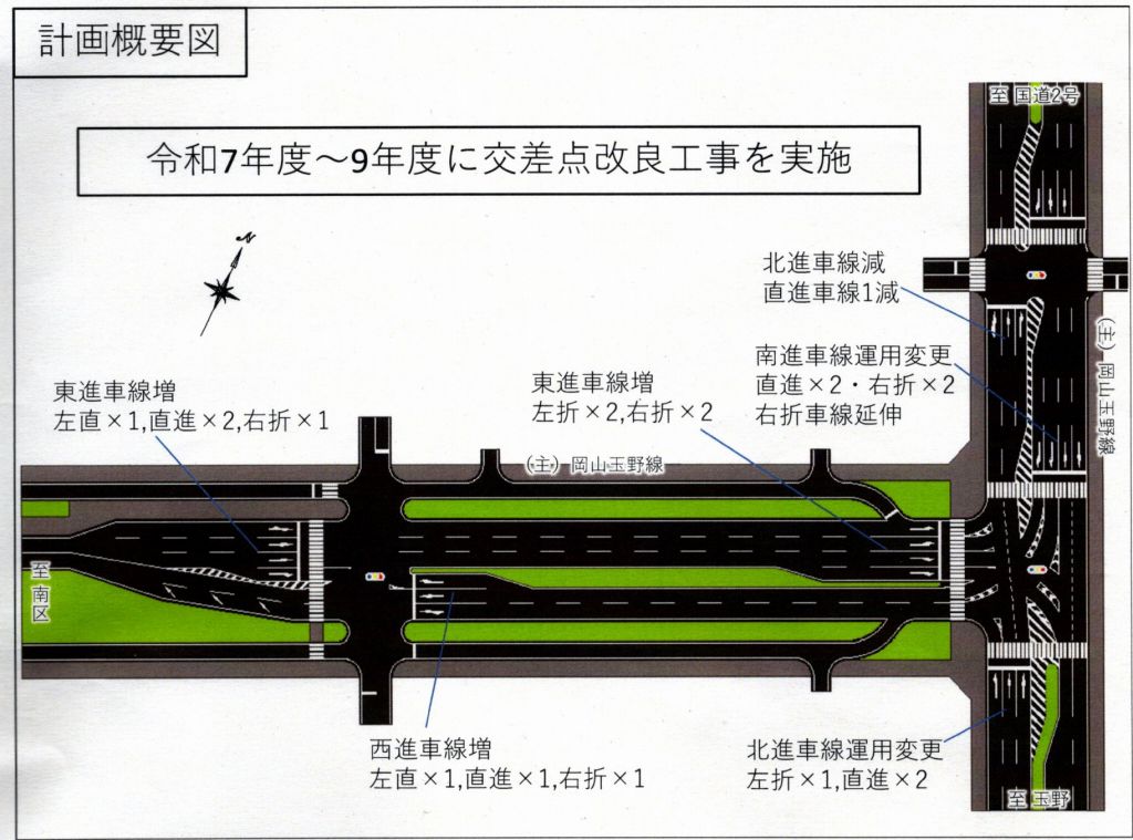 令和8年の正月明け1月10日から岡南大橋東詰交差点付近の道路拡幅工事が始まりました。岡山玉野線の(岡南大橋東部分)渋滞緩和を目的とする道路改良工事で、第一期として今年の秋頃を目途に車道拡幅工事が行われます。