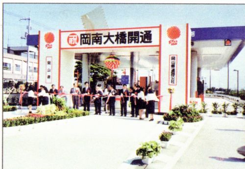 岡南大橋東詰交差点の電光掲示板に祝開通の表示