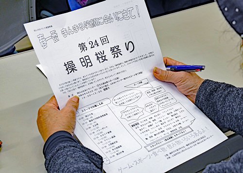 2月11日(水)18:00より「第24回操明桜祭り準備委員会」を岡山ふれあいセンター第一研修室にて各種団体、28名(委員含む)で行いました。全戸配布する「チラシ」と「実施案」を合わせ見て、変更・追加・確認などの検討を行いました。また、雨天時は岡山ふれあいセンター、大・小ホール・他(飲食も含む)で対応すると説明がありました。