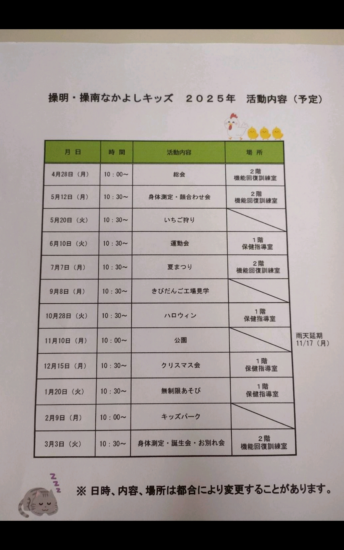 住民登録されている生後4ヵ月までの赤ちゃんがお ◎さんさん育児相談(保健センター) 令和 6年度 6月3日(月)・9月2 日(月) ・12月2日(月)・令和7年 3月3日(月) 場 所:中区保健センター 持参品:親子手帳(母子健康手帳)、バスタオル 詳しくは、操南学区ホームページ「子育てのペー 対象 0~3歳の子供さん ◎操南幼稚園3歳児保育支援(4月~7月) ◎親子クラブ 令和4 年度より操明・操南親子クラブが合併して、「おやこクラブ操明・操南なかよしキッズ」と名称変更しました。 ☆年間行事予定(多少の変動あり)