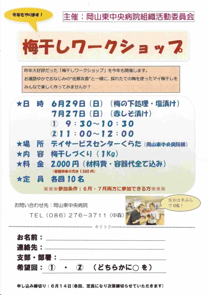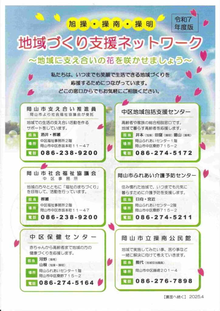 最後に同席されたサポーター会員の方から提供された情報を記します。岡山東中央病院からは梅干しワークショップ、地域包括支援センターからは相談窓口、地域づくり支援ネットワークの資料が提供されました。その他公民館だより、中区保健センター業務案内、操南いきいき教室、フレイル健康チェックについても資料・紹介がありました。尚これらの資料は操南公民館に置いてあります。