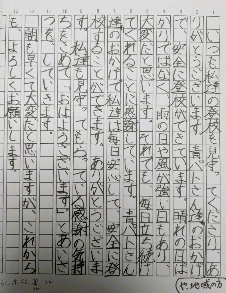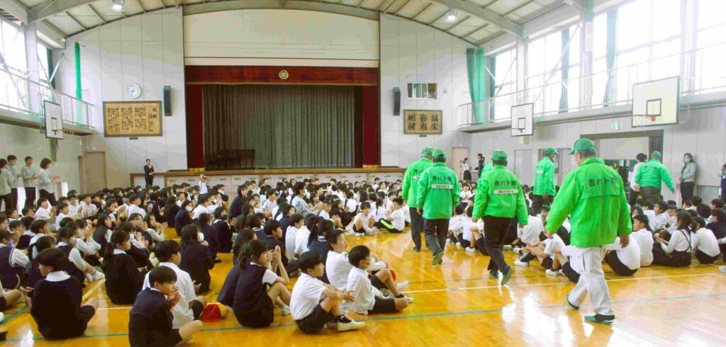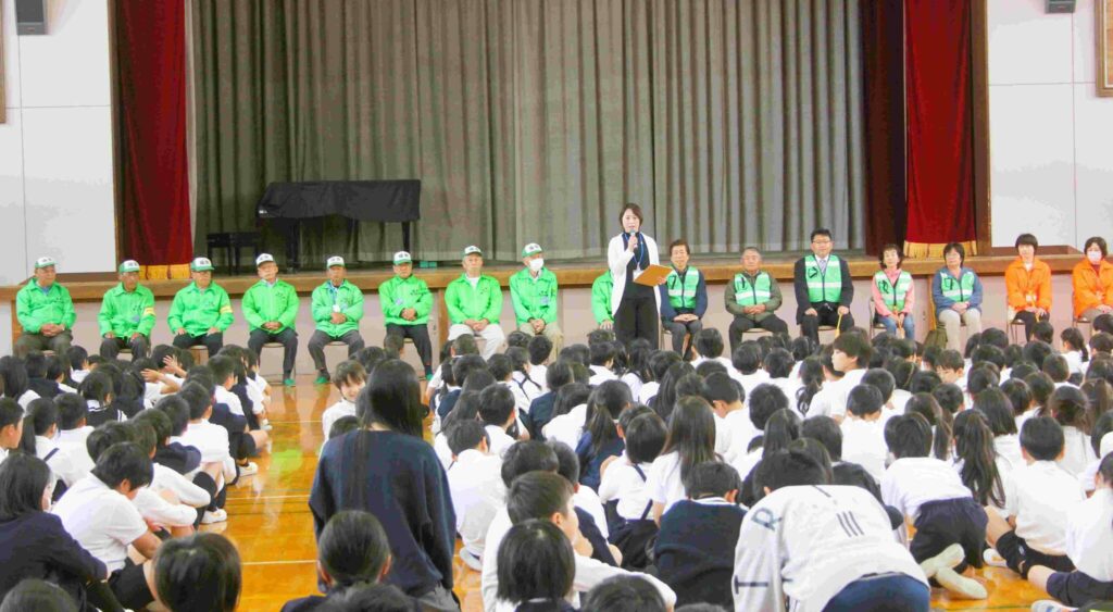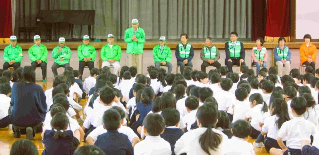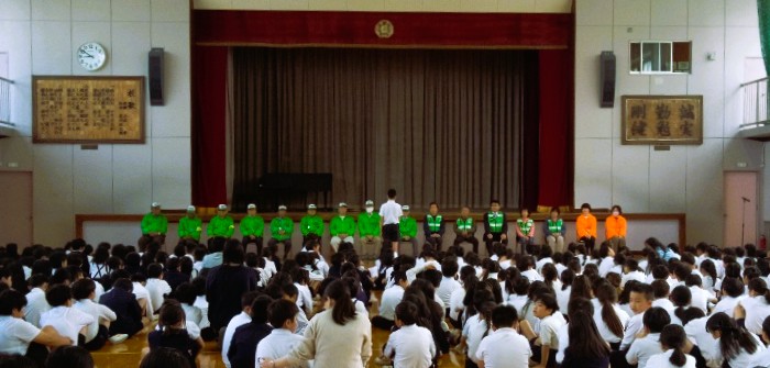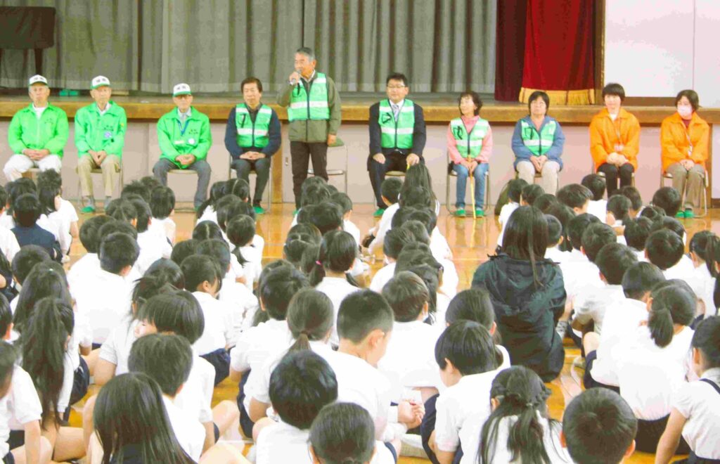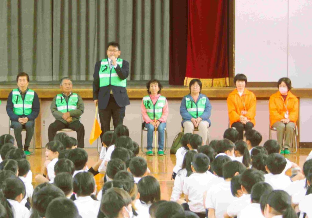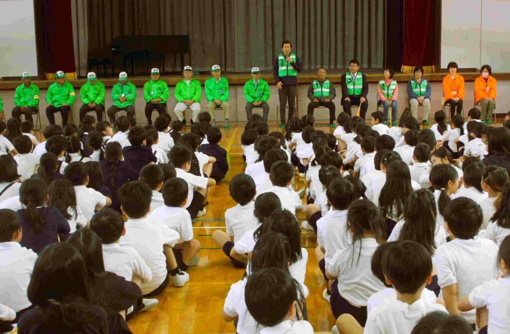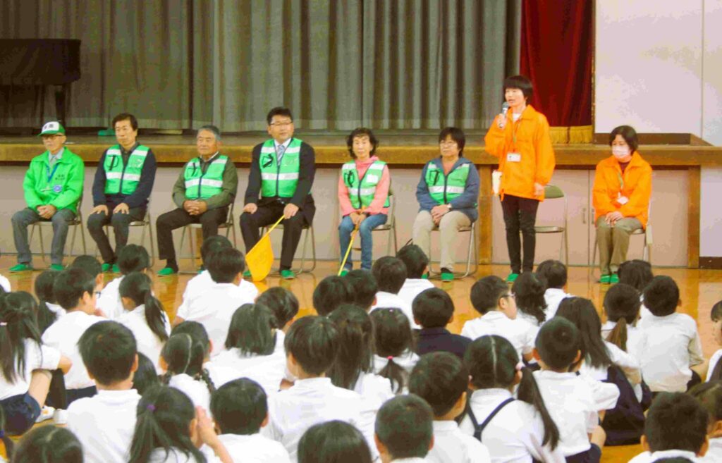 5月12日(月)8時半から操南小学校体育館で通学路の見守りを行っている青パト隊、支え合いの会、民児協の方へ小学校児童が感謝を伝える会が催うされました。永井校長から全校生徒に向け「通学時の安全を見守ってくださる地域の方へ感謝をお伝えしましょう」と挨拶があり、見守り実施の各代表から見守りを通じた感想・児童へのお願い等が話されました。見守りを実施されている全員から自己紹介の後生徒代表から感謝の言葉がありました。最後に生徒が元気に校歌斉唱を歌い上げ通学時の安全行動を誓いました。