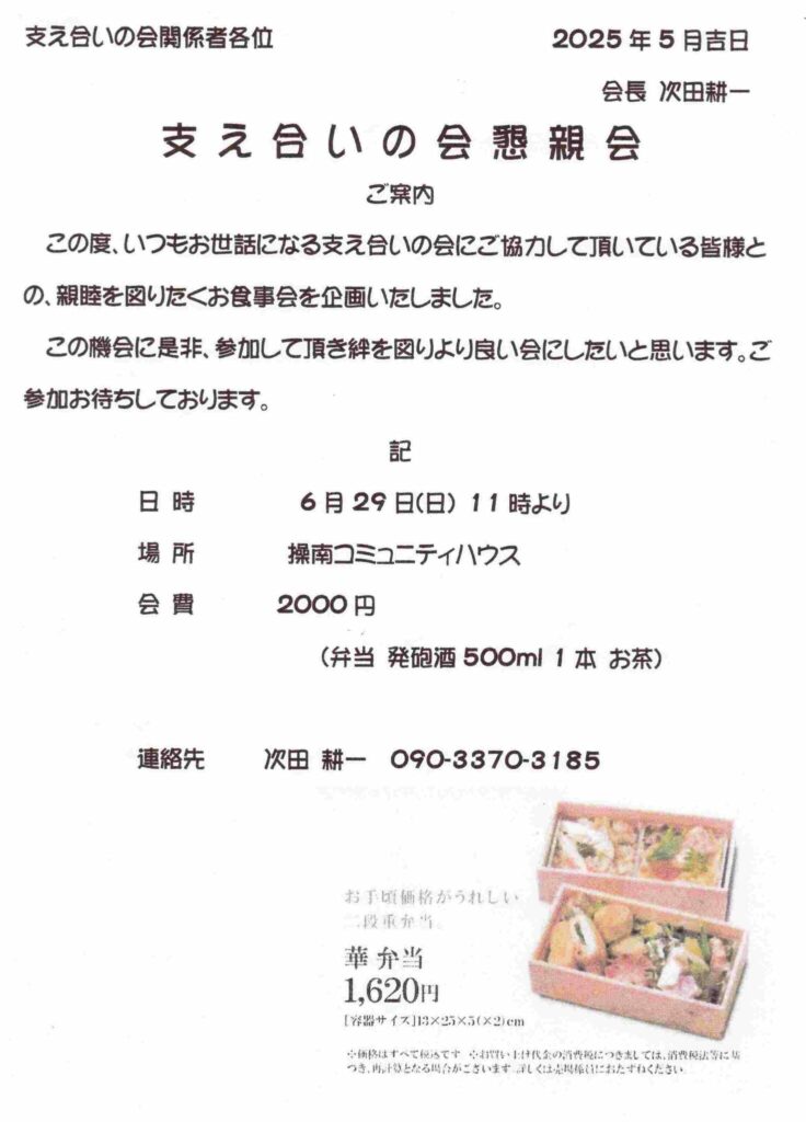 5月23日(金)10時からコミュニティーハウスで開催された定例会議の主要な議事についてお知らせします。会員16名、サポート5団体から6名が参加、笠松副会長の司会で議事(前回のふりかえり、報告・検討事項、その他サポート団体からのお知らせ)が進められました。                                  ① 報告事項: *5月9日「等身大の自画像たこを作って揚げてみよう」と銘打ったアートイベントに次田・近藤・熊代さんが参加され今冬計画されているたこあげに備えられました。只自画像作成に時間を要することから簡略化して本番に備えられるとの報告がありました。                                     *5月12日(月)小学校体育館で「児童見守り活動への感謝の集い」がありました。                *5月17日の連町総会で支え合いの会事業計画、役員改選案が承認されました。(次田会長、笠松・国方・山崎副会長、京林会計、西村監査)                                         ② 検討事項:*下校時の見守り活動の定点・定例化は現状では困難。ながら見守りの充実に向け会員確保に努力をしたい。                                                  *その他見守り活動の役割分担について青パト隊との話し合いを通じて効率的な運用を目指したい。横断歩道が無い箇所での横断行為に対し車両・児童にどう対処すべきか?との疑問が提示されました。*三世代交流事業:*もちつきは公民館講座に協賛する形で12月27日に実施します。担当者を決定、リーダーに国方副会長、たこあげは来年1月10日公民館・支え合いの会共催で実施します。こちらも担当者を決定、リーダーに次田会長が選ばれました。    *防災すごろく実施のため次回定例会議後会議出席者でやってみる予定です。経験者の方から問題点の指摘があり検討、解消案が低減される予定です。                                     *子ども食堂を開いて世代間の交流を図れないかとの提案がありました。操明での実施例も踏まえ検討することとなりました。*親睦会の開催:6月29日(日)11時~コミュニティーハウスで開催されます。支え合いの会に関心のある方もご自由に参加ください。
