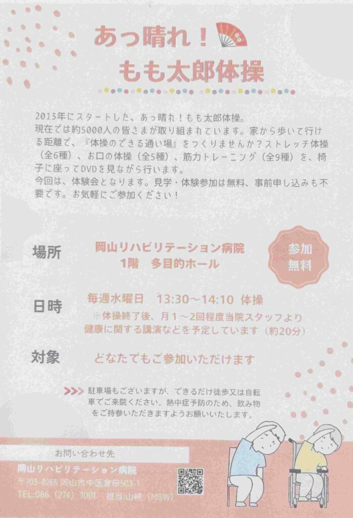 あっ晴れ!もも太郎体操の輪を拡げよう! 投稿日:2025年9月21日 お口の体操、筋力トレーニング体験会が毎週水曜日、岡山リハビリテーション病院1階多目的ホールで行われます。誰でも参加できます。(参加費無料、予約不要)生活の一部に取り入れ健康寿命の維持・延長を取得しましょう。 カテゴリー:お知らせ
