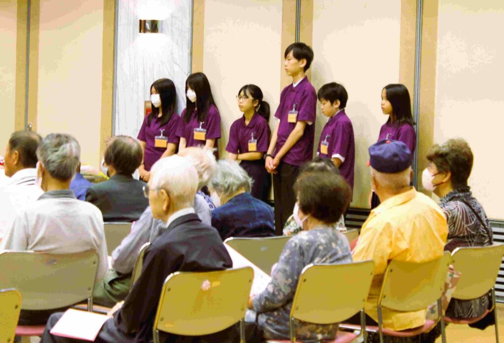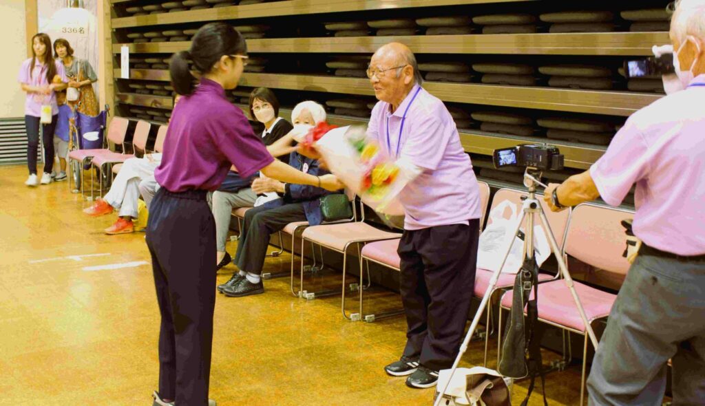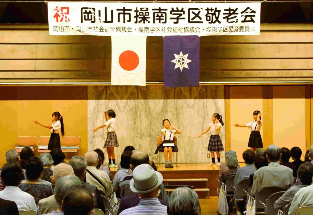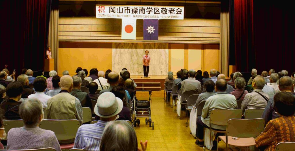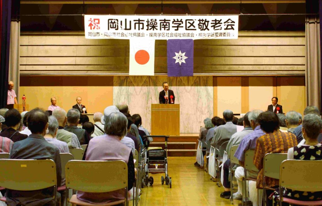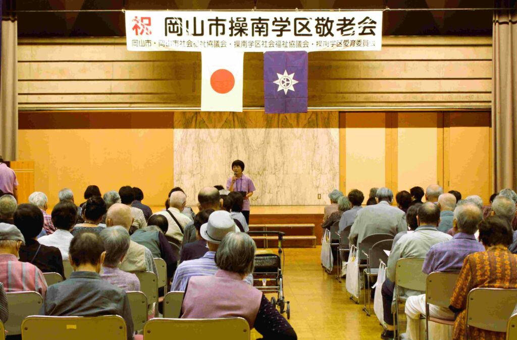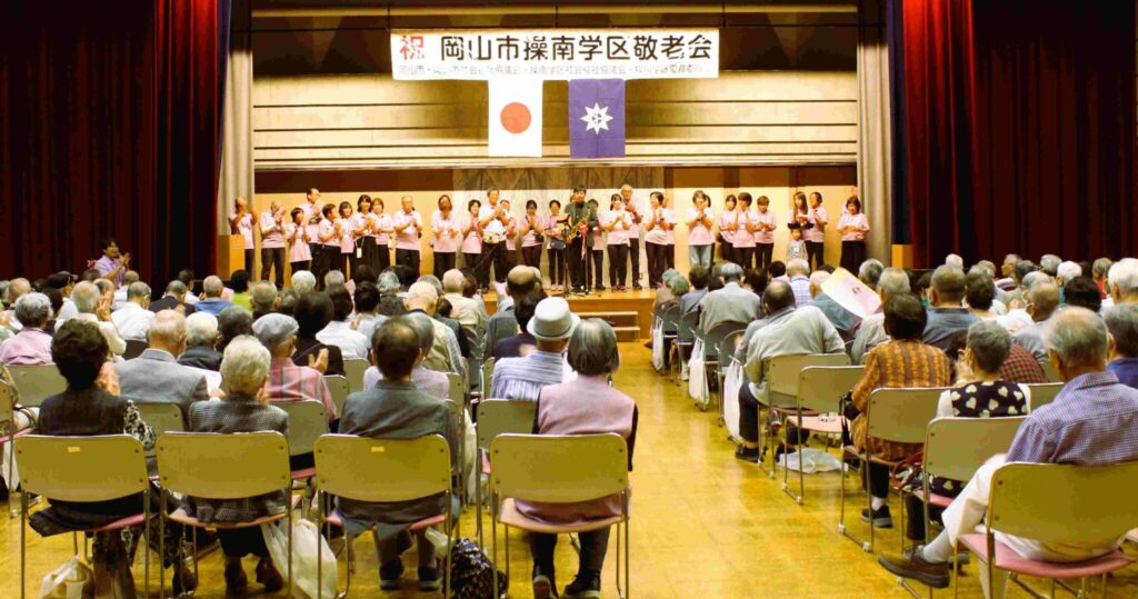 10月5日(日)10時から岡山ふれあいセンターで第27回操南学区敬老会が開催されました。9時半の受付から続々と参加者が詰めかけました。参加者は昨年越えの162名をかぞえ中学生ボランティア・社協・愛育の方々から温かいもてなしを受けました。会は第1部式典、第2部ふれあい、第3部演芸から成り第2部終了時には20分間の休憩が設けられ、操南中学校茶道部部員から抹茶のもてなしがありました。主催者挨拶の中で岡山市社会福祉協議会田中事務局長から操南学区敬老会開催への感謝、中止になっていたふれあい祭り再開への期待が述べられました。年々敬老会参加者の増加が予想される中参加したくてもできない方への配慮が今後検討されるべきでしょう。敬老会開催に関わった皆様ご苦労様でした。