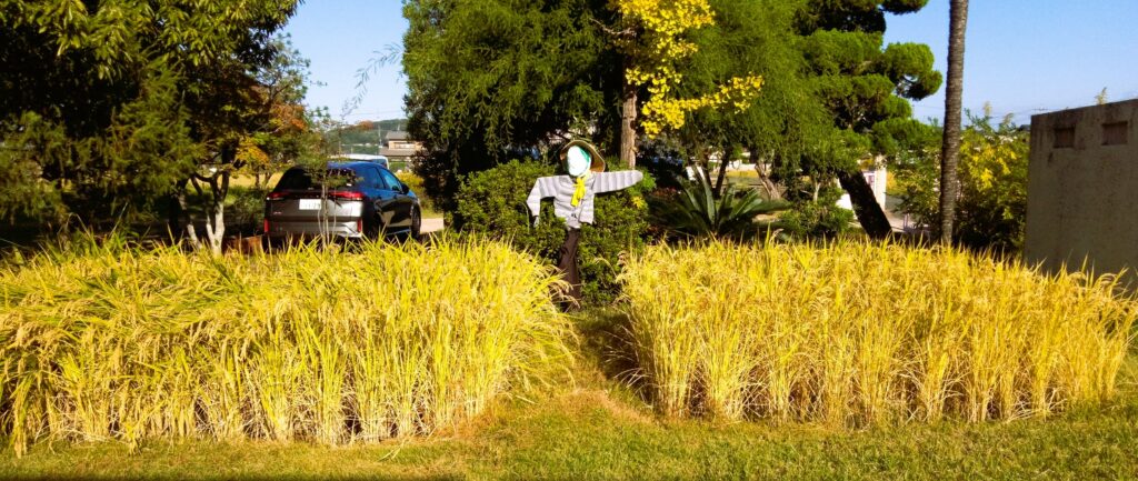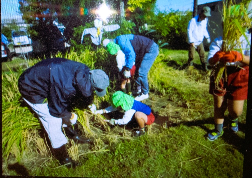 操南幼稚園で稲刈り 投稿日:2025年10月30日 10月28日(火)園児(年長・年中)が鎌を使って稲刈りを行いました。利き手に鎌を持ち反対の手で稲わらをつかみ器用に稲を刈り取りました。最初は地域の方の助けを借りての作業でしたが回を重ねるごと上達、そのスピードに驚かされました。刈り取った稲束は吊るして天日で干します。稲束の量が昨年より多く豊作を喜び合いました。この情報・写真は操南幼稚園(藤田園長)から届けられました。 たわわに実った稲 カテゴリー:学校行事