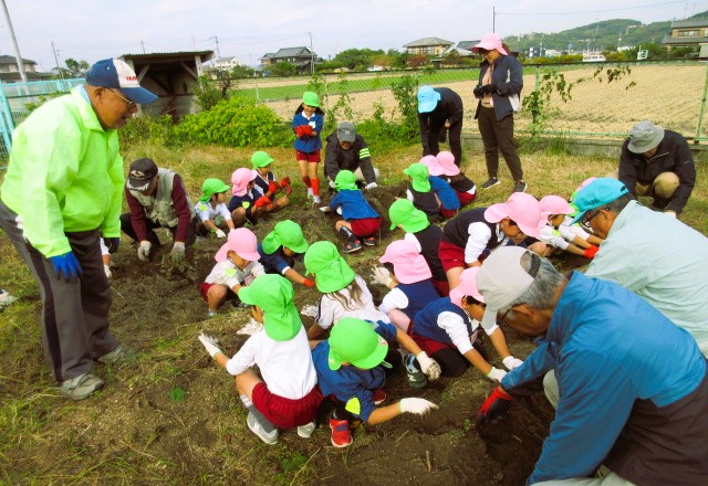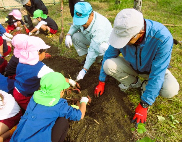 11月5日(水)操南幼稚園園児(年長・年中)がサツマイモを掘り上げました。5月28日に苗を植え付け後水やり、除草、蔓上げと先生・園児の細やかな世話で夏の酷暑をしのぎ5か月余りでどこまでサツマイモが育っているか?ワクワクしながらのサツマイモ掘りでした。軍手をはめた手で素早く根っこの部分の土を掘り下げサツマイモがのぞくと更に猛烈な速さで土を掘り下げサツマイモを掘り上げていました。今年も豊作で園児の歓声が園庭に響きわたりました。写真提供は操南幼稚園(藤田園長)から頂きました。