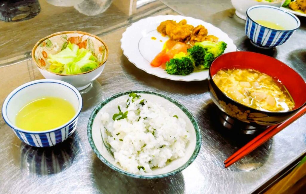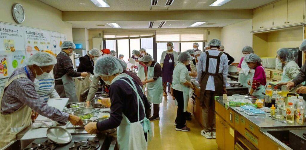 12月2日(火)操南公民館で今年度2回目の料理教室が開催されました。(主催:操南学区社会福祉協議会・栄養改善協議会) 中区保健センターの石部栄養士のご挨拶、岡山県立大学栄養学科の実習生 松井・石川様から栄養不良にならない食事をしっかり食べて、ずっと元気でいてくださいとのお話を頂きました。当日の献立は「わかめご飯」「和風タンドリーチキン」「白菜のおひたし」「かきたま汁」で栄養改善協議会の皆さんの指導を受けながら調理に取り組みました。日頃目にする材料を加熱する際に電子レンジを使用すると簡単なことも教えて頂きました。出来立ての料理を頂きながら、「美味しかった。調理は楽しい。見た目よりボリュームがあり満足。家で作ってみたい。」等々の感想が聞かれました。来年度も計画して欲しいとの要望もありました。この情報・写真は社協 島田会長から届けられました。