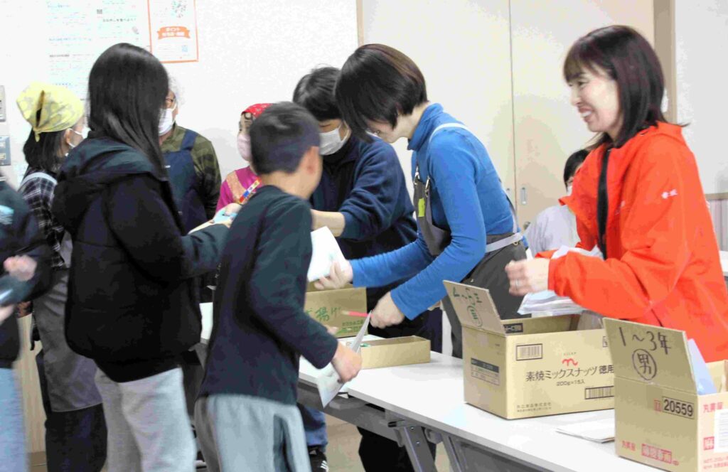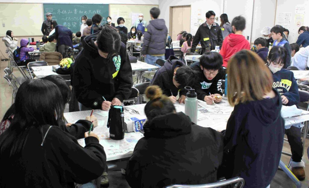 12月27日(土)操南公民館に小学生30人余が集合(操南・旭操・操明他)書初めに挑戦その後は餅つき体験、つきたて餅をきな粉・砂糖醤油・ぜんざいで賞味、感想文を書き、プレゼントを手に笑顔がいっぱい拡がりました。 (主催:操南公民館、協力:操南支え合いの会) 学生ボランティア19名、保護者6名の方の支援を受けイベントはスムーズに進行、定刻13時に参加者は「来年も来たい」と家路につきました。公民館・操南with・支え合いの会の皆さんはじめボランティアの方々ご苦労様でした。