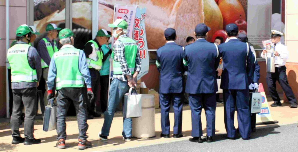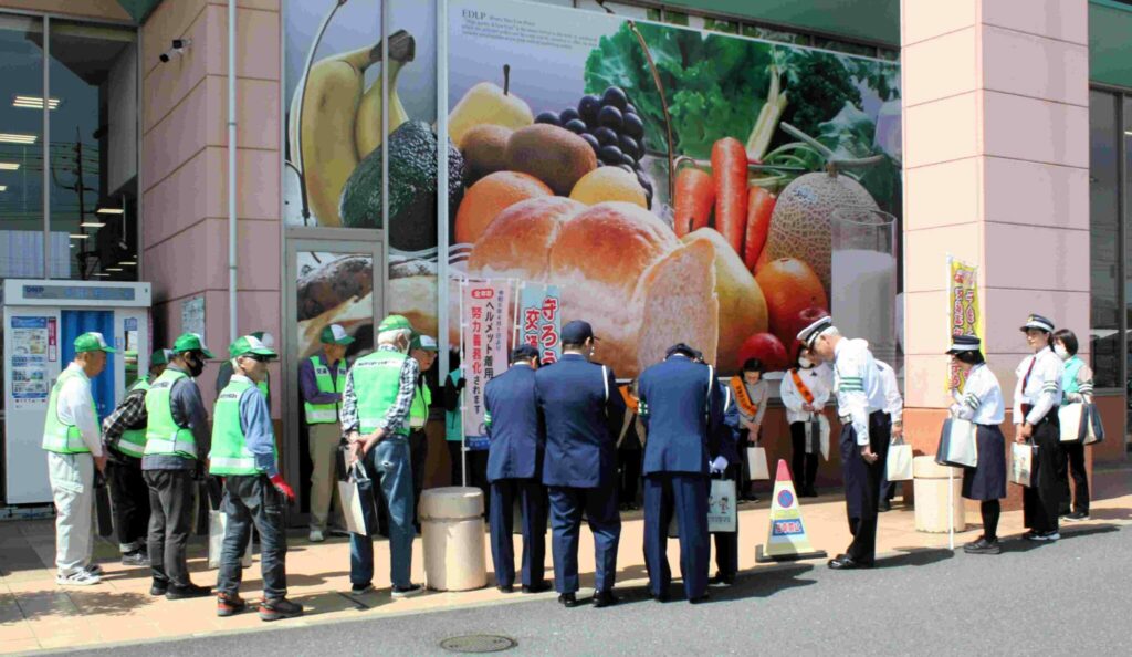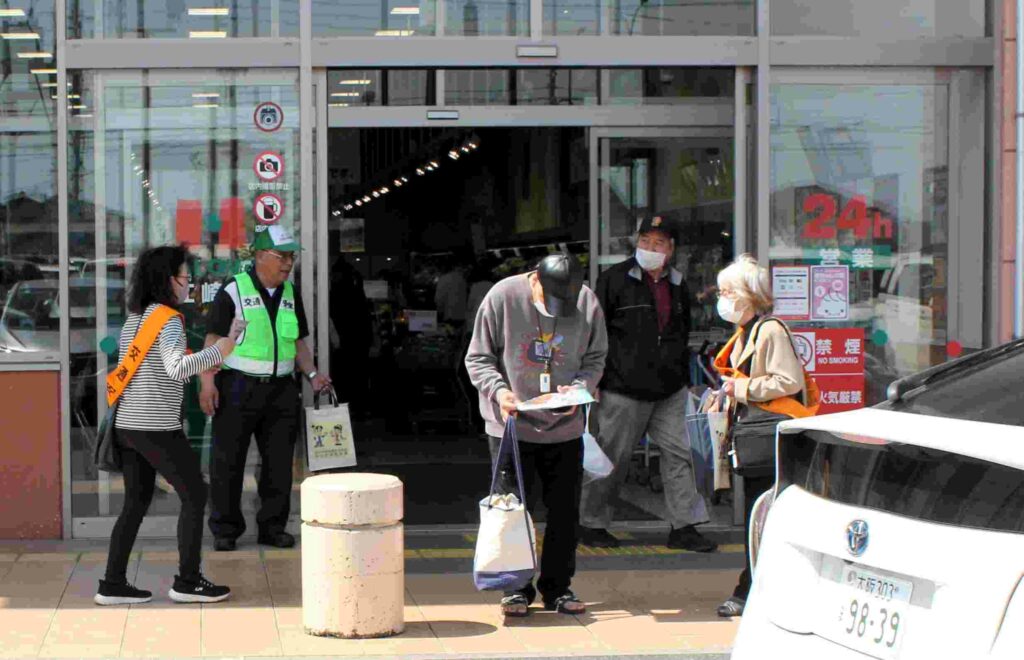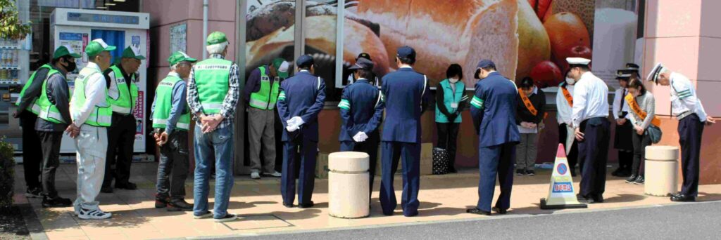 4月12日(日)交通安全協議会(近藤勉会長)の青パト隊員の皆さんがスーパーマーケット・ハローズ利用者、45号線を走行する車のドライバーに向けて交通安全遵守をお願いしました。4月6日~15日は春の交通安全市民運動(交通ルール 守って笑顔 晴れの国)です。又4月1日~自転車の交通違反に青切符が導入されました。今週から新入生の登校が始まりました。安全運転は勿論児童への見守り・声掛けで交通事故の無い学区を目指しましょう。
