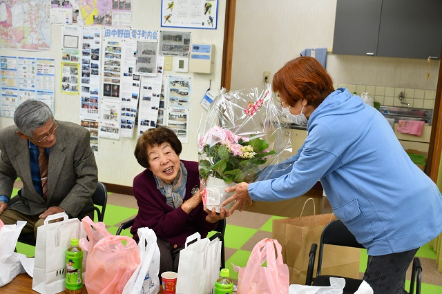 委員の異動では、退会される和気昭子さんにあじさいの鉢花をお贈りしました。長年、清掃活動へのご協力とグラウンドゴルフを一緒に楽しみました。体調を考慮して退会されるとのことで残念です。大変お世話になりました。