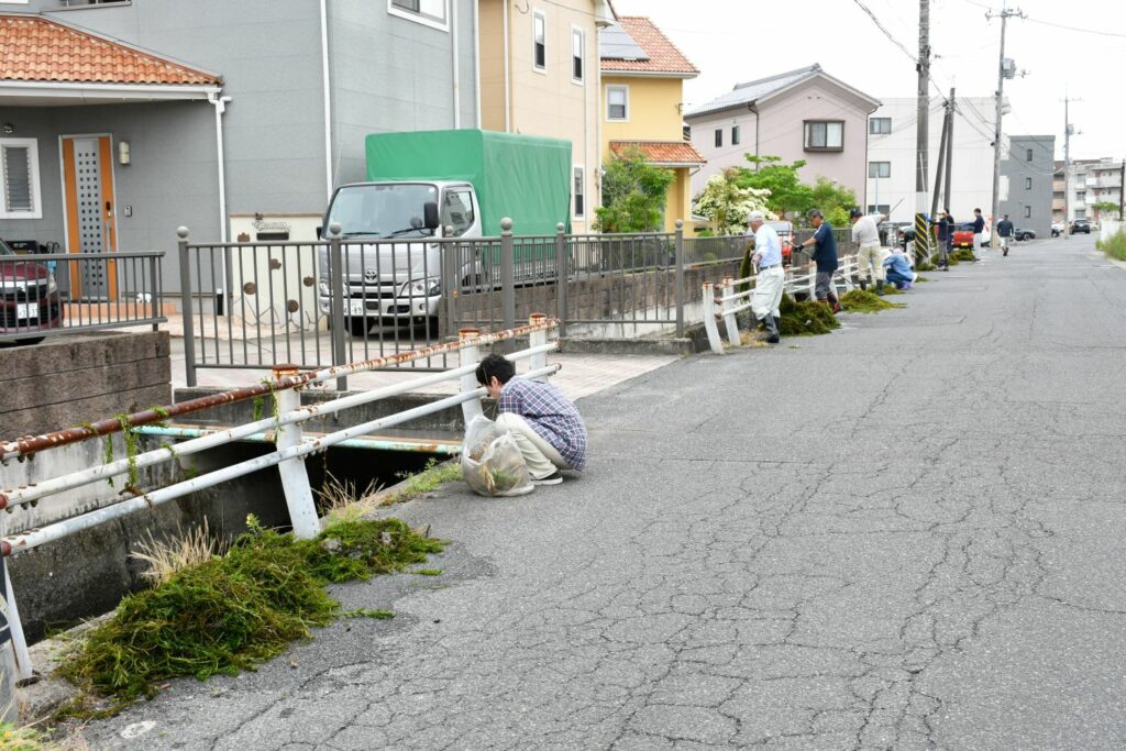6月14日(土)8時から、9組ごみステーション付近~県公舎沿い西北にかけての用水路藻引き清掃を行いました。朝7時頃の天気は小雨がぱらついており心配しましたが、雨雲の切れ間1時間のうちに作業ができました。