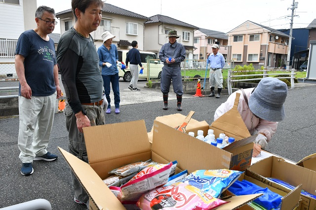 田中野田町内会は、岡山市水路浚渫等交付金申請の届出をしており、年度末に作業実施報告を行い交付を受けています。休憩時のお茶、お持ち帰りの飲物・菓子類は作業への協力御礼としてその一部を充てています。